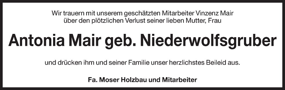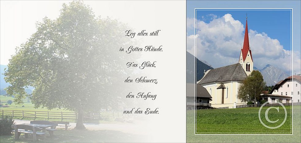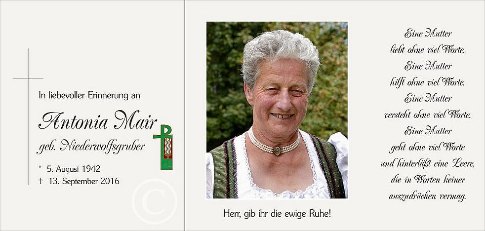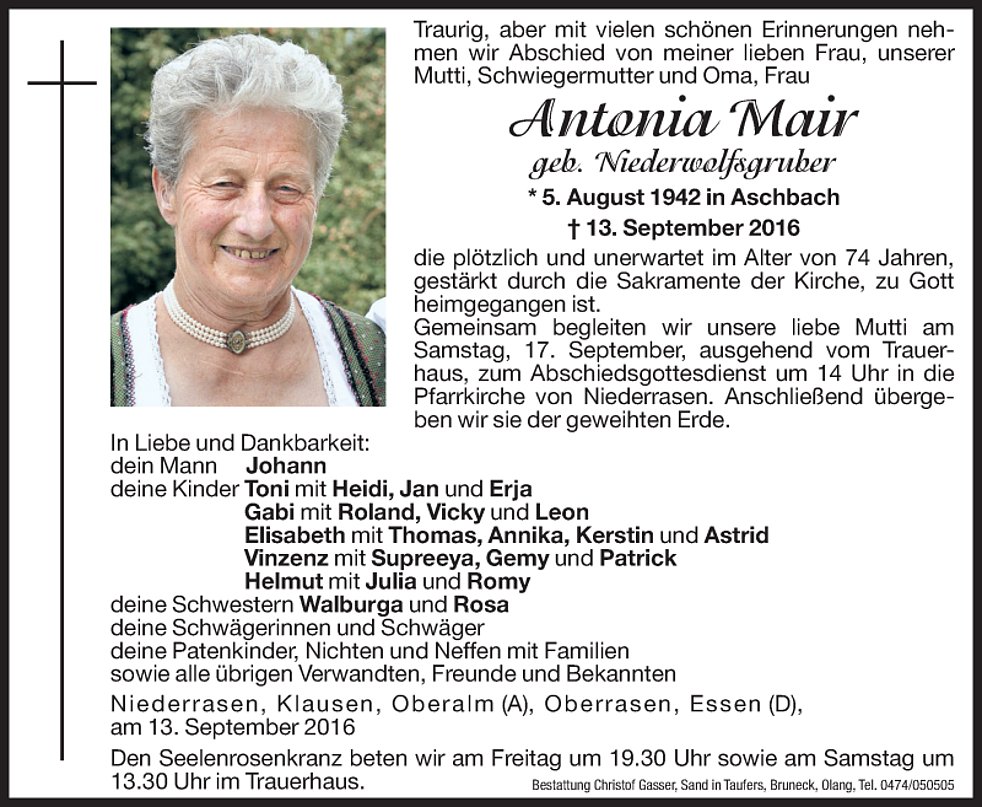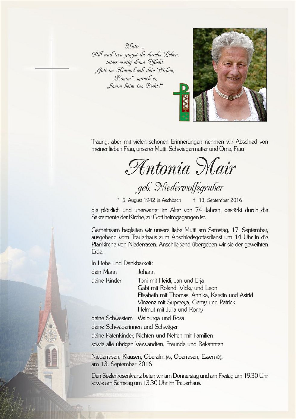 Gemeinsam begleiten wir unsere liebe Mutti am Samstag, 17. September, ausgehend vom Trauerhaus zum Abschiedsgottesdienst um 14 Uhr in die Pfarrkirche von Niederrasen. Anschließend übergeben wir sie der geweihten Erde.