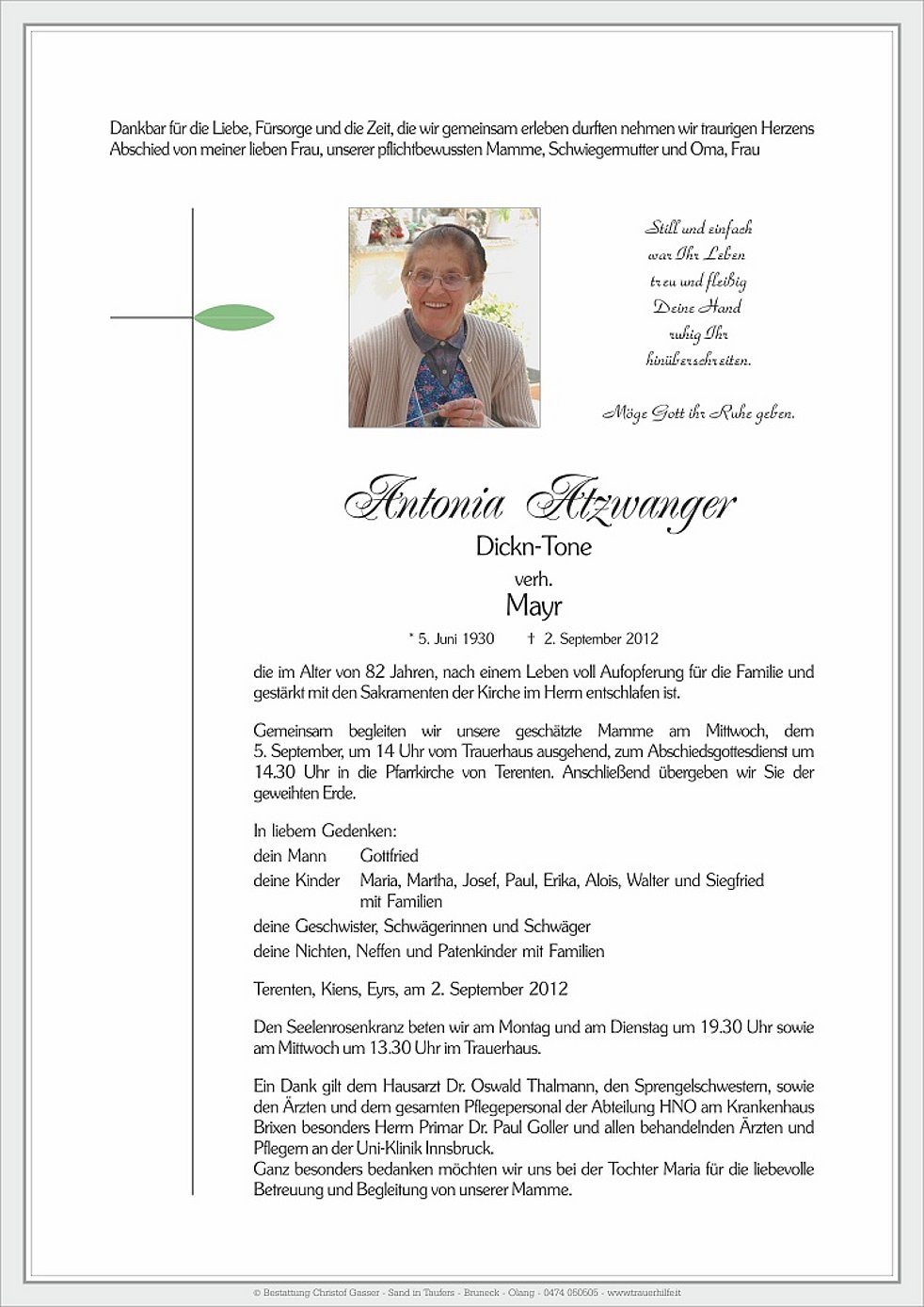 5. September, um 14 Uhr vom Trauerhaus ausgehend, zum Abschiedsgottesdienst um 14.30 Uhr in die Pfarrkirche von Terenten.