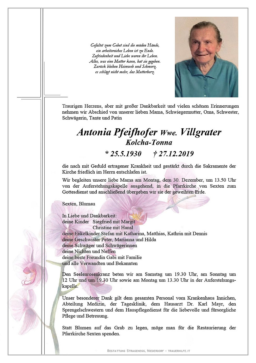 Unser besonderer Dank gilt dem gesamten Personal vom Krankenhaus Innichen, Abteilung Medizin, der Tagesklinik, dem Hausarzt Dr. Karl Mayr, den Sprengelschwestern und dem Hauspflegedienst für die liebevolle und fürsorgliche Pflege und Betreuung.