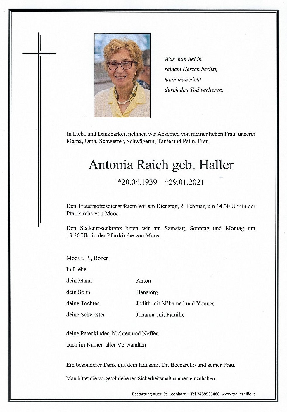 Den Trauergottesdienst feiern wir am Dienstag, 2. Februar, um 14.30 Uhr in der Pfarrkirche von Moos.