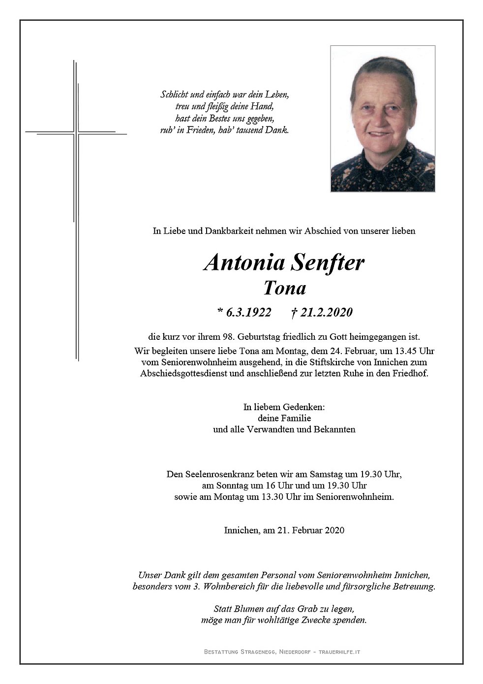 Wir begleiten unsere liebe Tona am Montag, dem 24. Februar, um 13.45 Uhr vom Seniorenwohnheim ausgehend, in die Stiftskirche von Innichen zum Abschiedsgottesdienst und anschließend zur letzten Ruhe in den Friedhof.