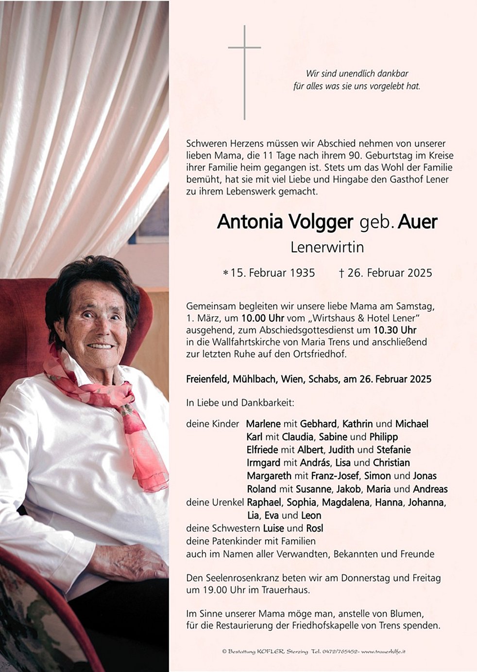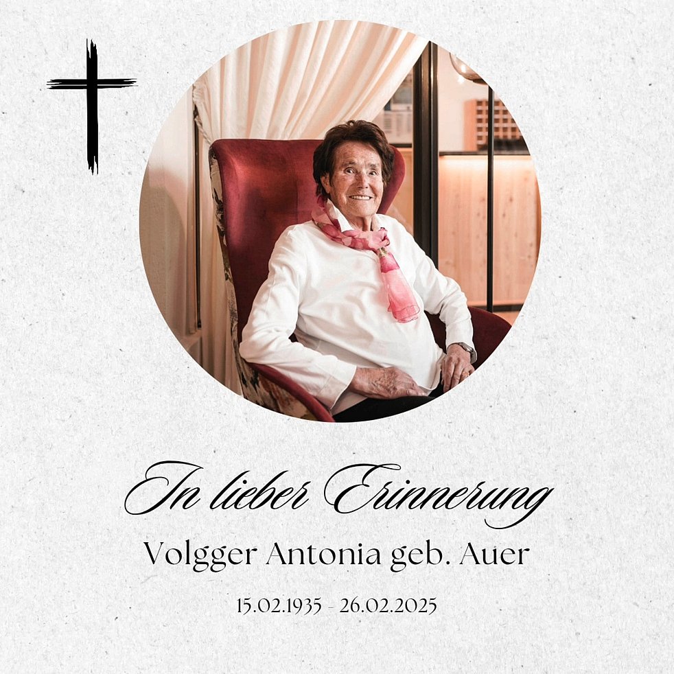 Gemeinsam begleiten wir unsere liebe Mama am Samstag, 1. März, um 10.00 Uhr vom „Wirtshaus & Hotel Lener“ ausgehend, zum Abschiedsgottesdienst um 10.30 Uhr in die Wallfahrtskirche von Maria Trens und anschließend zur letzten Ruhe auf den Ortsfriedhof.
