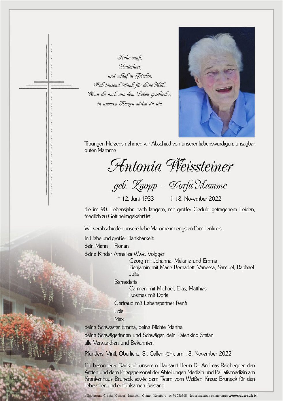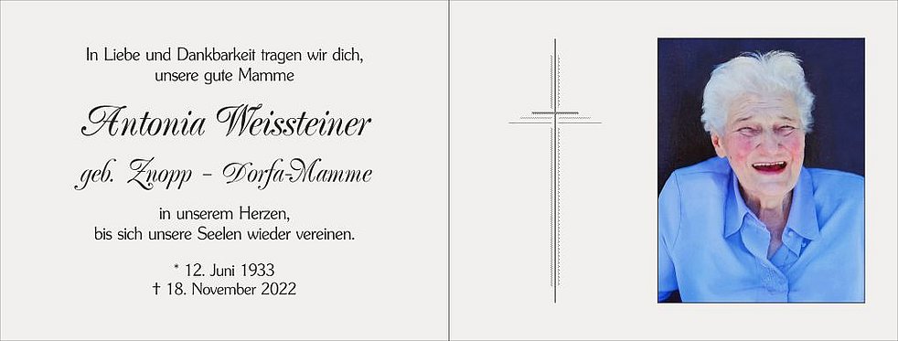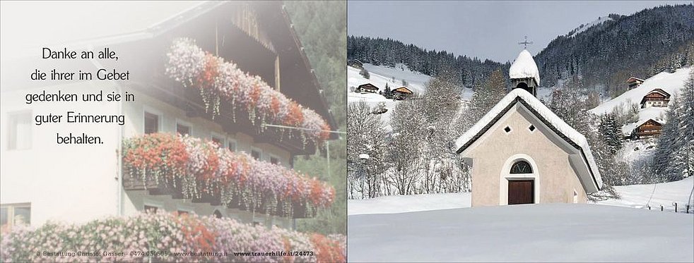 Ein besonderer Dank gilt unserem Hausarzt Herrn Dr. Andreas Reichegger, den Ärzten und dem Pflegepersonal der Abteilungen Medizin und Palliativmedizin am Krankenhaus Bruneck sowie dem Team vom Weißen Kreuz Bruneck für den liebevollen und einfühlsamen Beistand.