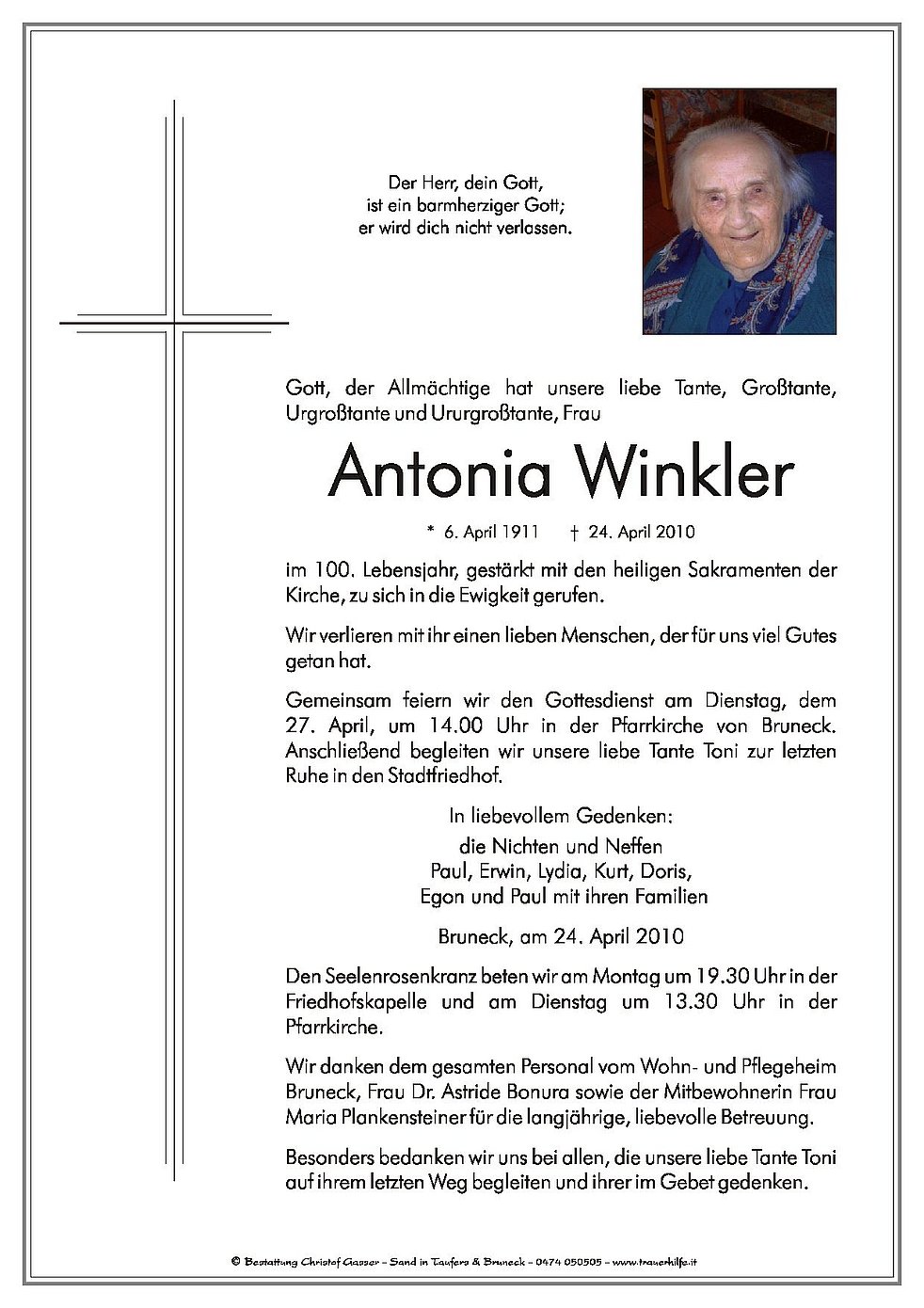 27. April, um 14.00 Uhr in der Pfarrkirche von Bruneck. Anschließend begleiten wir unsere liebe Tante Toni zur letzten Ruhe in den Stadtfriedhof.