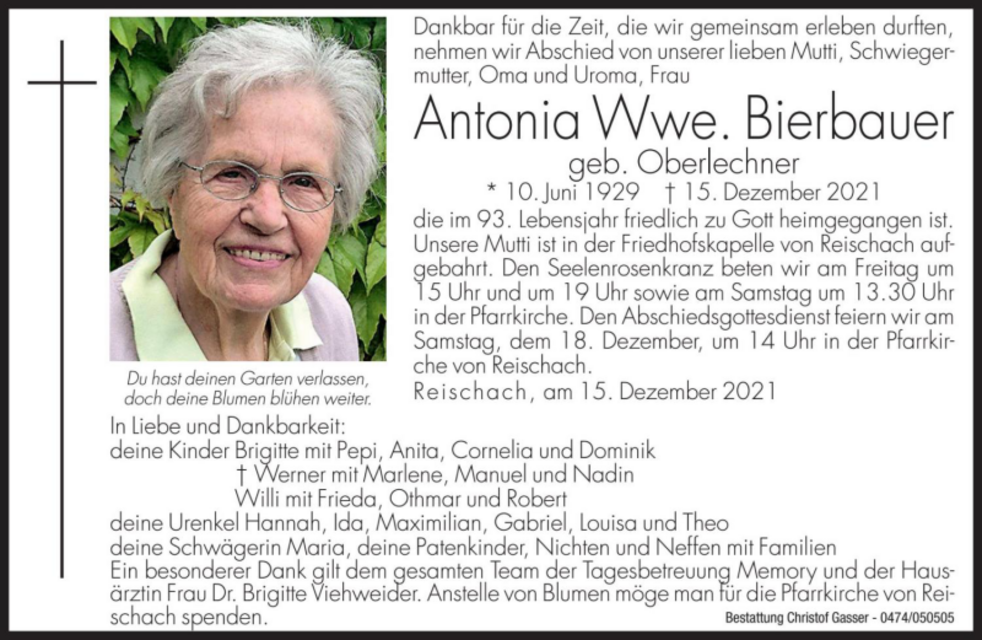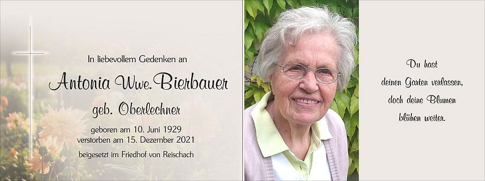 Anstelle von Blumen möge man für die Pfarrkirche von Reischach spenden.