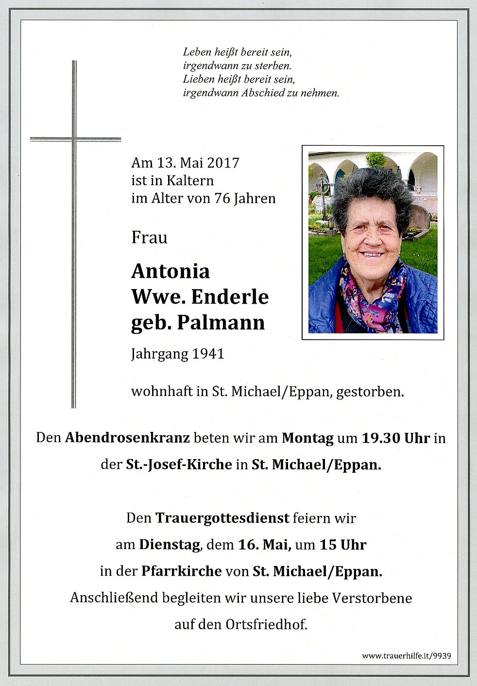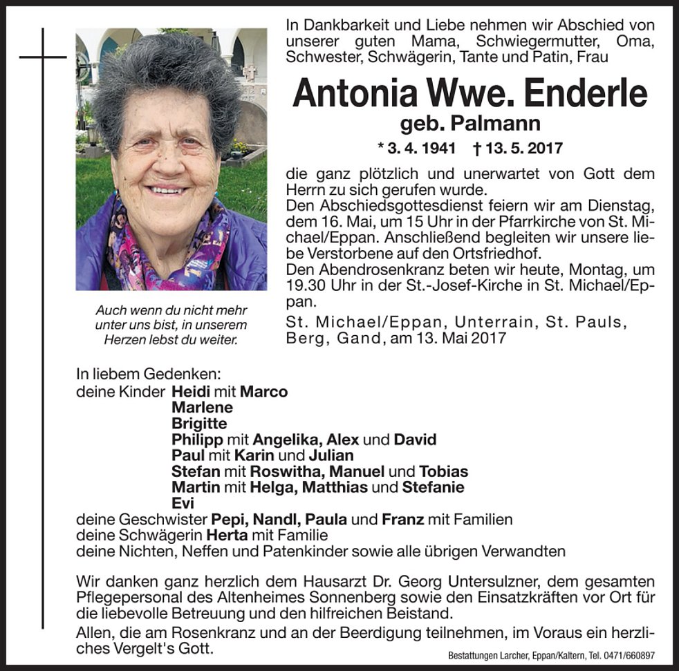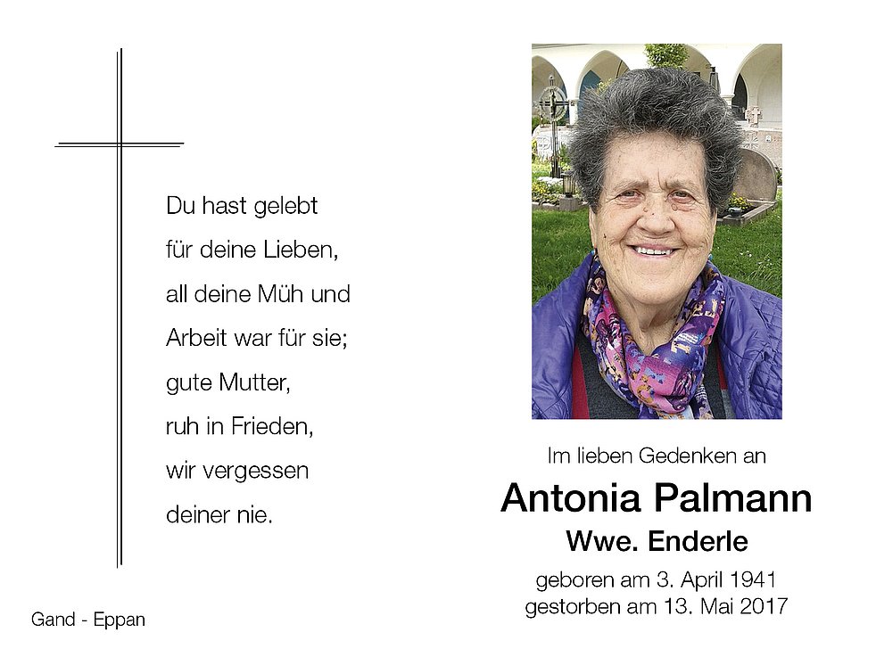 Den Abschiedsgottesdienst feiern wir am Dienstag, den 16. Mai um 15 Uhr in der Pfarrkirche von St. Michael/Eppan. Anschließend begleiten wir unsere liebe Verstorbene auf den Ortsfriedhof.