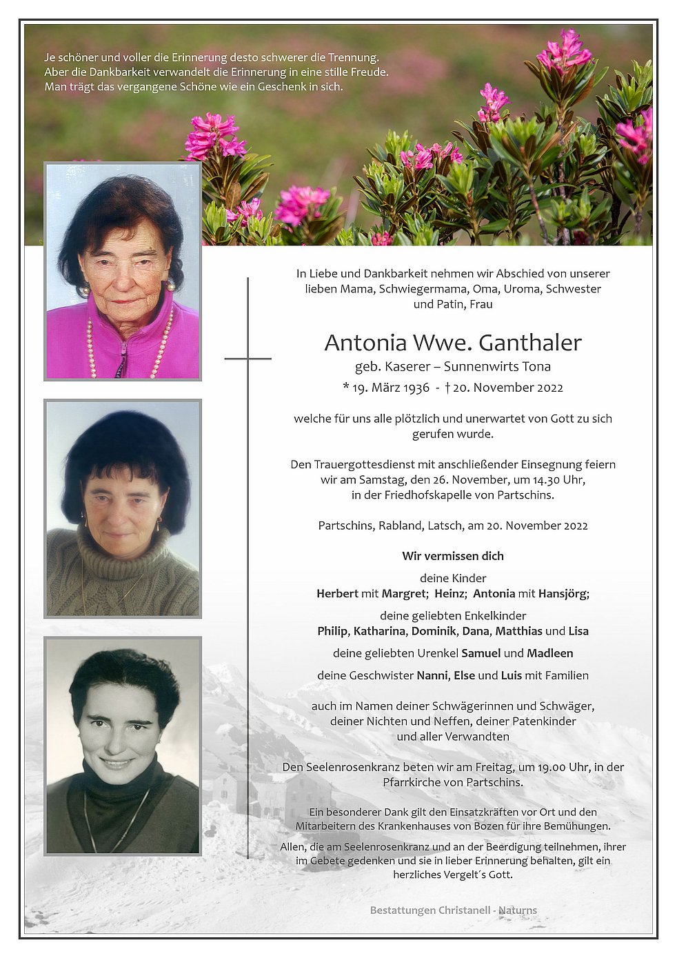 Den Trauergottesdienst mit anschließender Einsegnung feiern wir am Samstag, den 26. November, um 14.30 Uhr, in der Friedhofskapelle von Partschins.