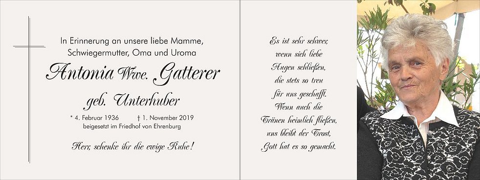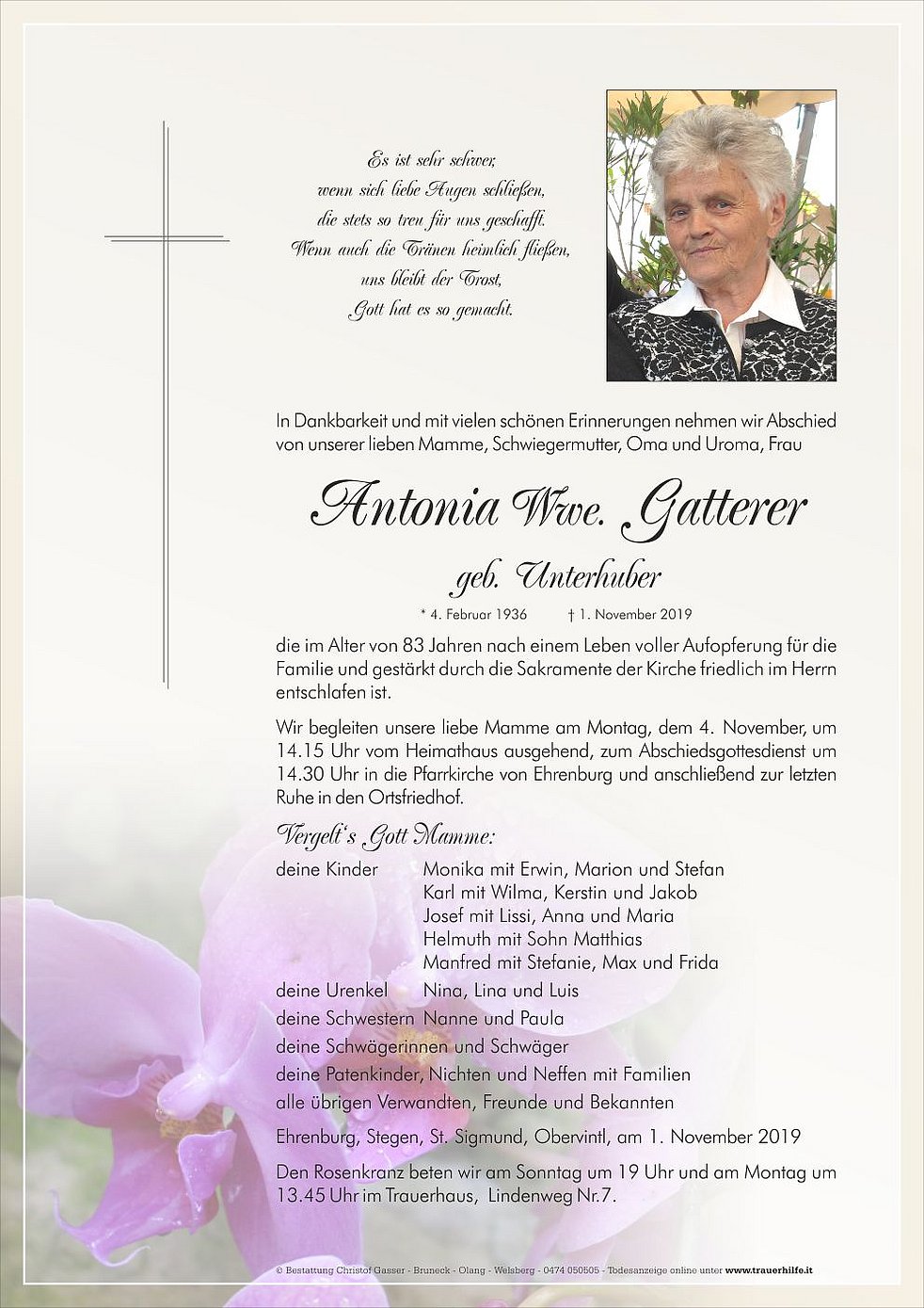 Wir begleiten unsere liebe Mamme am Montag, dem 4. November, um 14.15 Uhr vom Heimathaus ausgehend, zum Abschiedsgottesdienst um 14.30 Uhr in die Pfarrkirche von Ehrenburg und anschließend zur letzten Ruhe in den Ortsfriedhof.