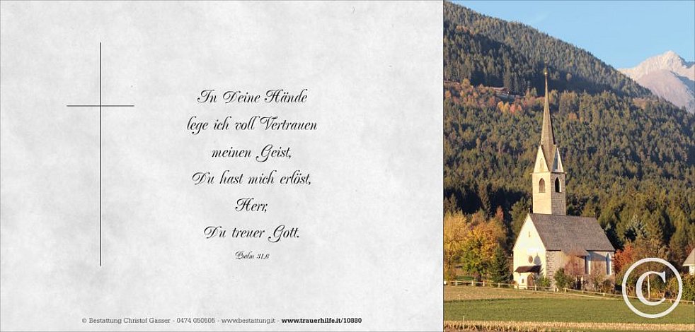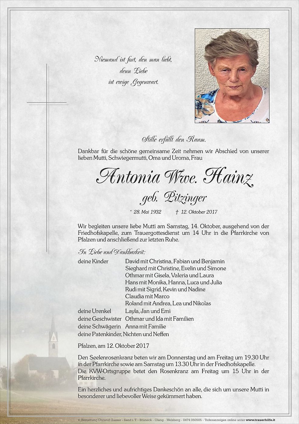 Wir begleiten unsere liebe Mutti am Samstag, 14. Oktober, ausgehend von der Friedhofskapelle, zum Trauergottesdienst um 14 Uhr in die Pfarrkirche von Pfalzen und anschließend zur letzten Ruhe.