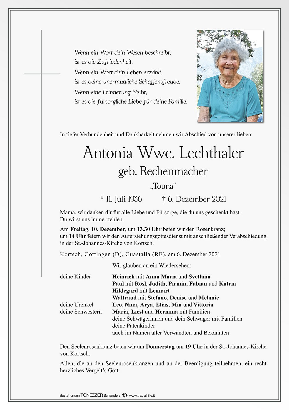 Allen, die an den Seelenrosenkränzen und an der Beerdigung teilnehmen, ein recht herzliches Vergelt’s Gott.