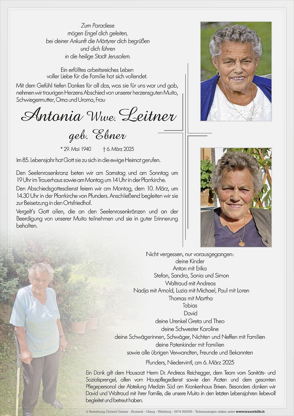 Ein Dank gilt dem Hausarzt Herrn Dr. Andreas Reichegger, dem Team vom Sanitäts- und Sozialsprengel, allen vom Hauspflegedienst sowie den Ärzten und dem gesamten Pflegepersonal der Abteilung Medizin Süd am Krankenhaus Brixen. Besonders danken wir David und Waltraud mit ihrer Familie, die unsere Muito in den letzten Lebensjahren liebevoll begleitet und betreut haben.
