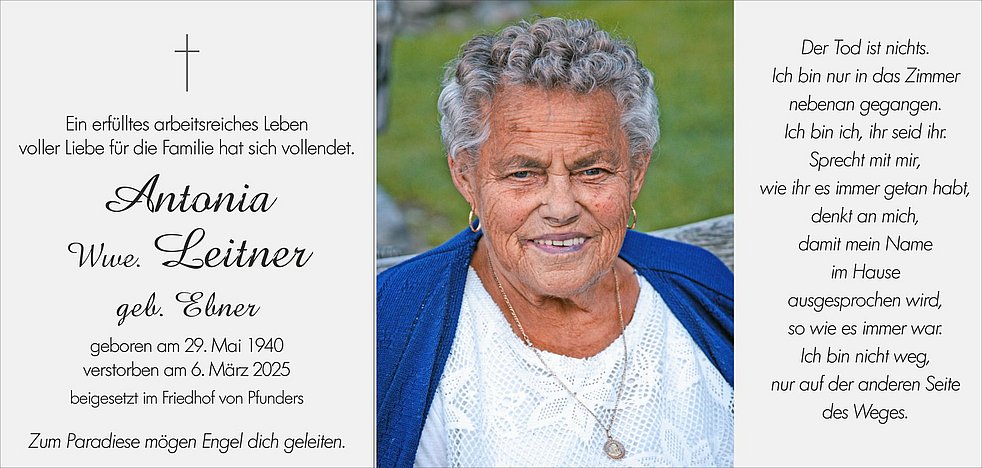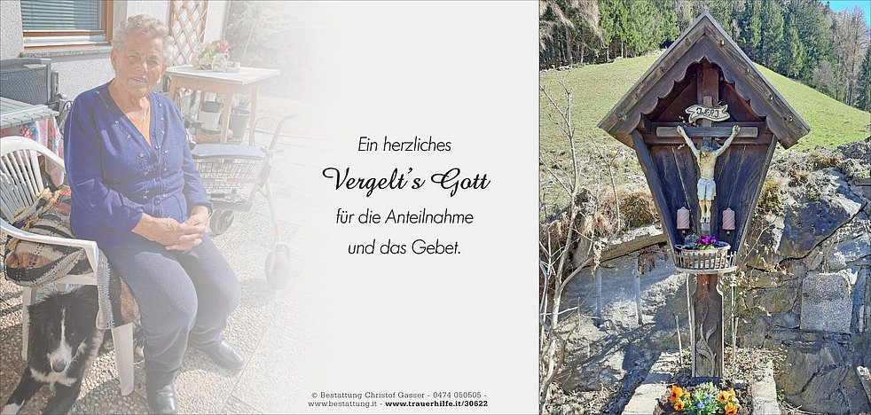 Den Abschiedsgottesdienst feiern wir am Montag, dem 10. März, um 14.30 Uhr in der Pfarrkirche von Pfunders. Anschließend begleiten wir sie zur Beisetzung in den Ortsfriedhof.