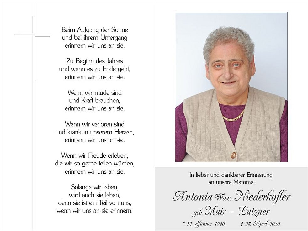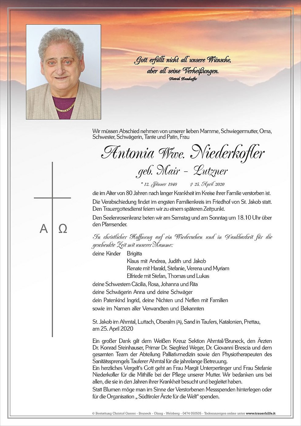 Ein herzliches Vergelt‘s Gott geht an Frau Margit Unterpertinger und Frau Stefanie Niederkofler für die Mithilfe bei der Pflege unserer Mutter. Wir bedanken uns bei allen, die sie in den Jahren ihrer Krankheit besucht und begleitet haben.