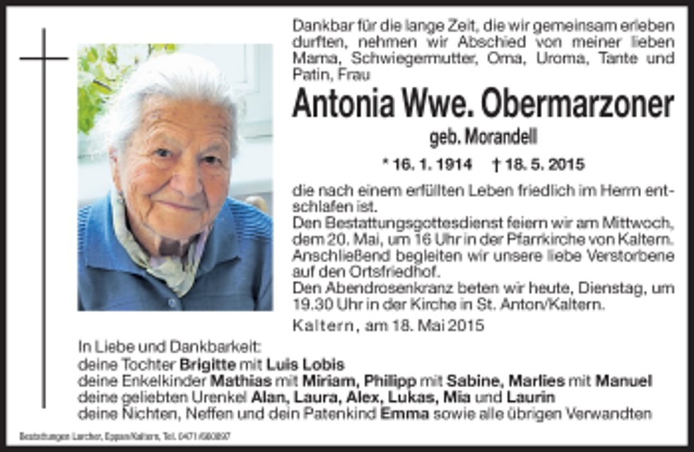 Den Bestattungsgottesdienst feiern wir am Mittwoch, den 20. Mai um 16 Uhr in der Pfarrkirche von Kaltern. Anschließend begleiten wir unsere liebe Verstorbene auf den Ortsfriedhof.