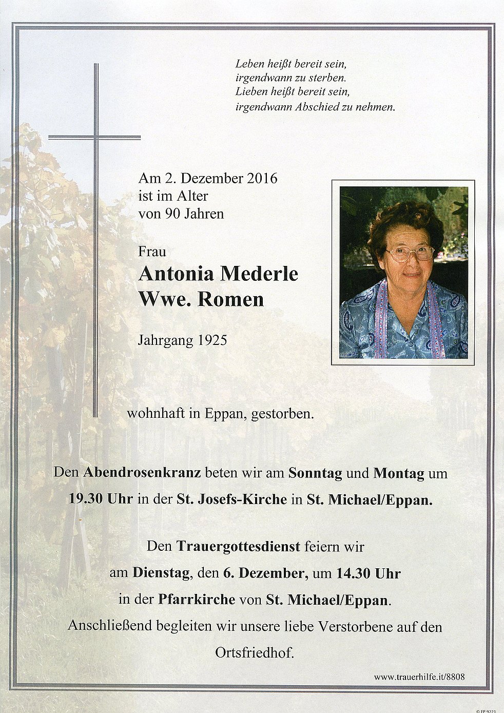 Wir verabschieden uns von unserer lieben Verstorbenen, bei der heiligen Messe am Dienstag, den 6. Dezember um 14.30 Uhr in der Pfarrkirche von St. Michael/Eppan. Anschließend begleiten wir unsere liebe Verstorbene auf den Ortsfriedhof.