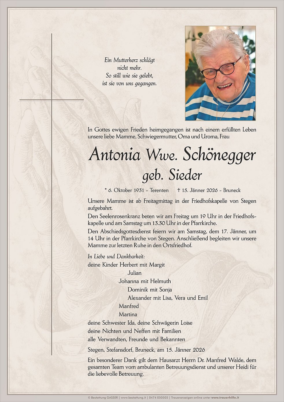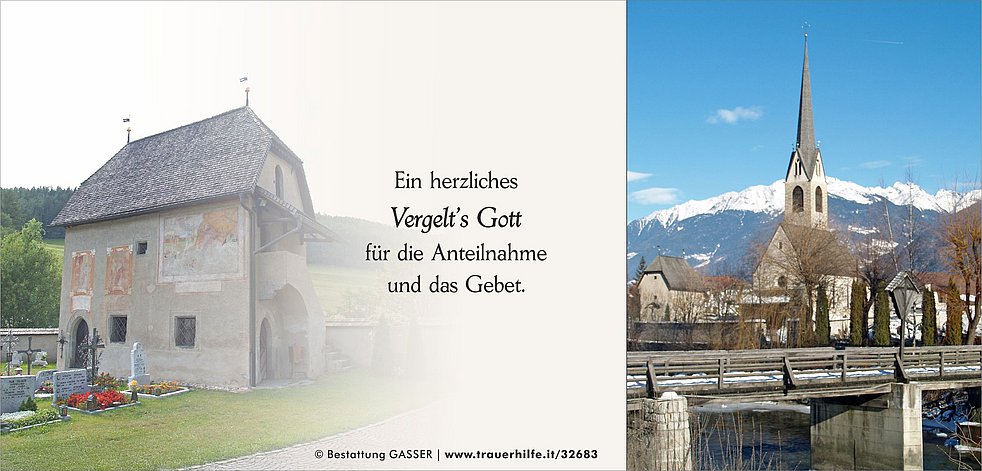 Den Abschiedsgottesdienst feiern wir am Samstag, dem 17. Jänner, um 14 Uhr in der Pfarrkirche von Stegen. Anschließend begleiten wir unsere Mamme zur letzten Ruhe in den Ortsfriedhof.