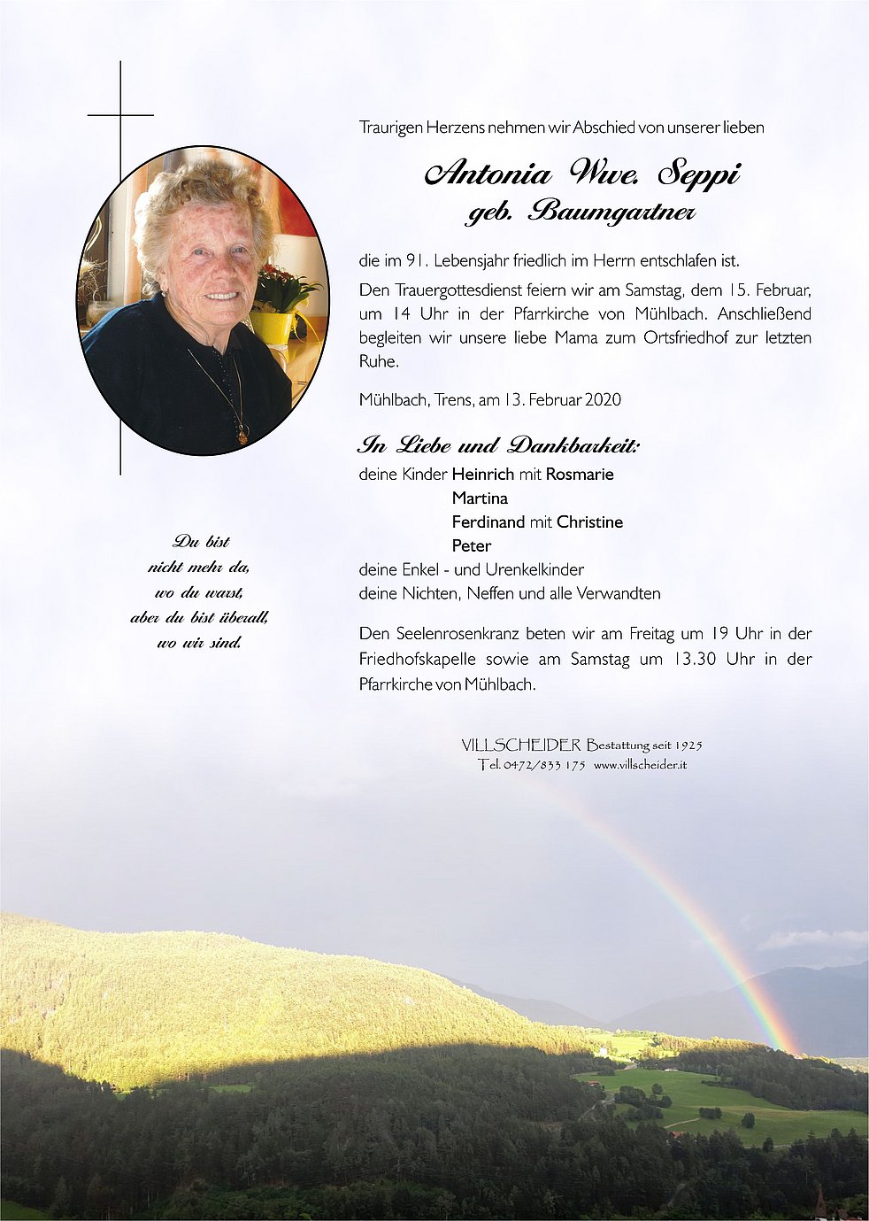 Begräbnisgottesdienst: 15.02. - 14:00 Uhr Mühlbach