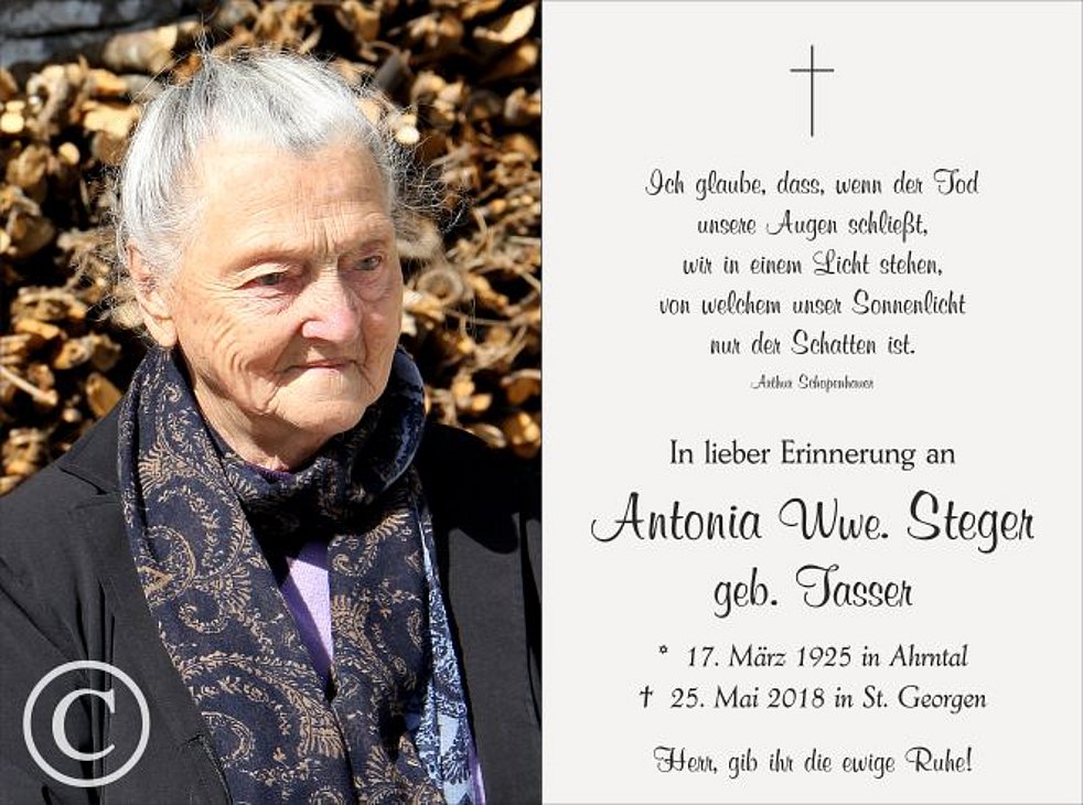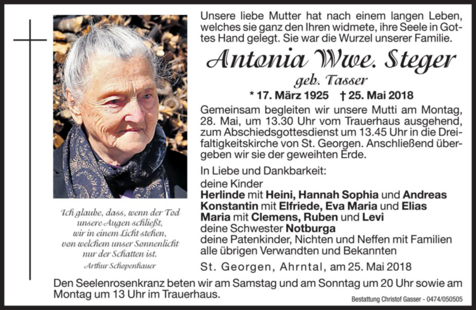 Gemeinsam begleiten wir unsere Mutti am Montag, 28. Mai, um 13.30 Uhr vom Trauerhaus ausgehend, zum Abschiedsgottesdienst um 13.45 Uhr in die Dreifaltigkeitskirche von St. Georgen. Anschließend übergeben wir sie der geweihten Erde.