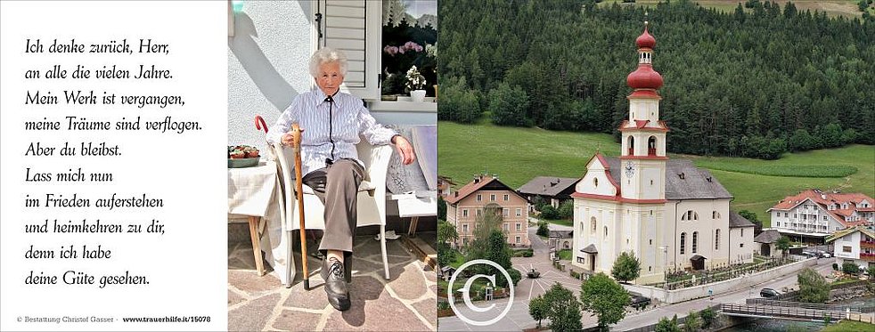 Gemeinsam begleiten wir unsere liebe Antonia am Samstag, dem 13. Juli, von der Auferstehungskapelle ausgehend, zum Abschiedsgottesdienst um 10.30 Uhr in die Pfarrkirche von Gais. Anschließend übergeben wir sie der geweihten Erde.