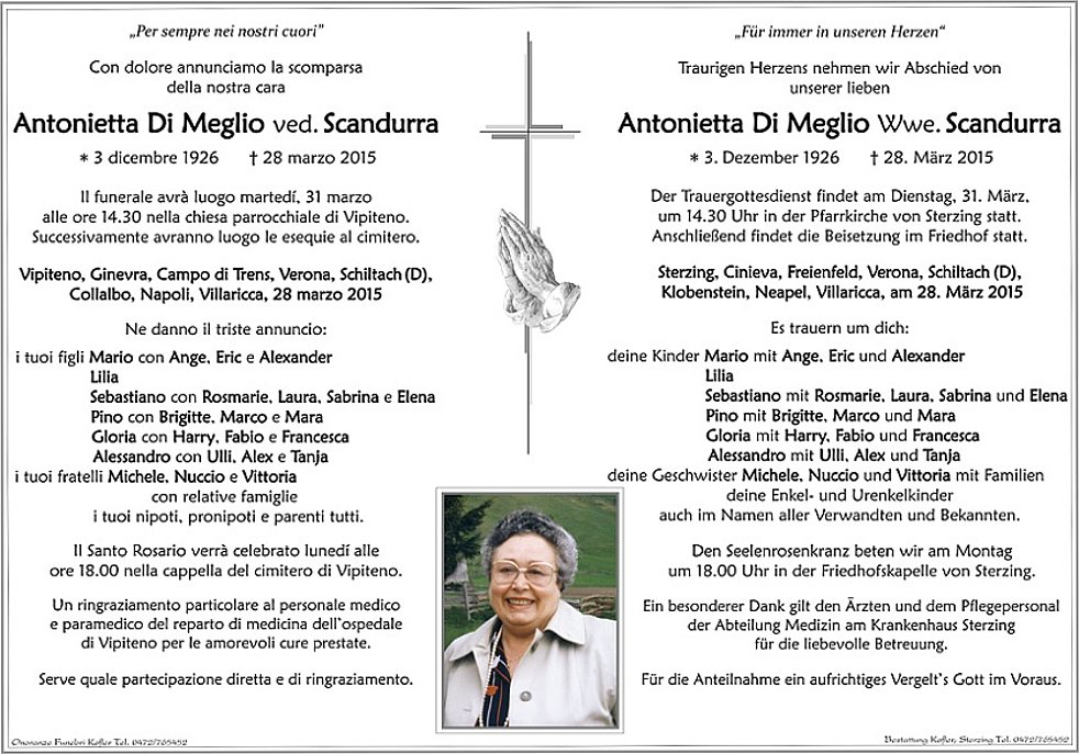 in der Pfarrkirche von Sterzing statt. Anschließend findet die Beisetzung im Friedhof statt.