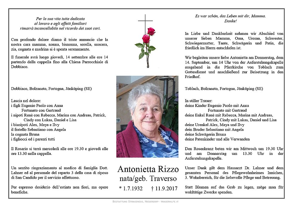 Wir begleiten unsere liebe Antonietta am Donnerstag, dem 14. September, um 14 Uhr von der Auferstehungskapelle ausgehend in die Pfarrkirche von Toblach zum Gottesdienst und anschließend zur Beisetzung in den Friedhof.