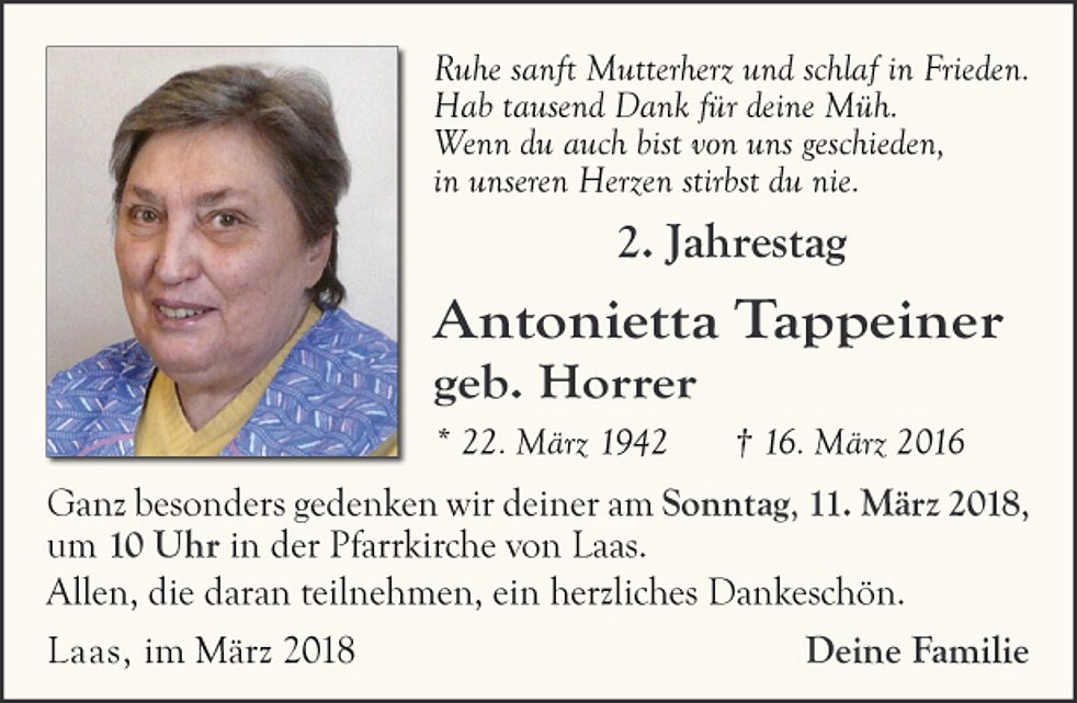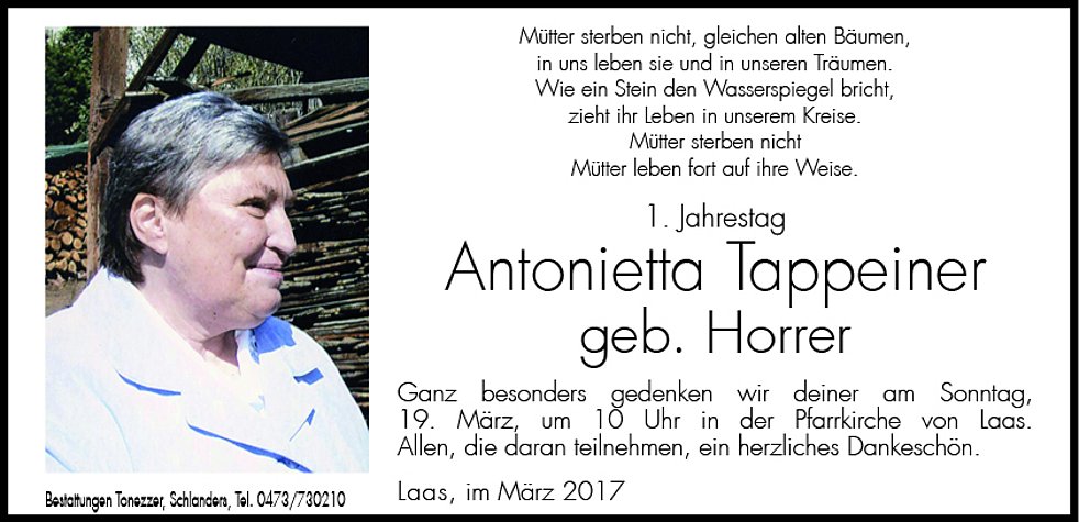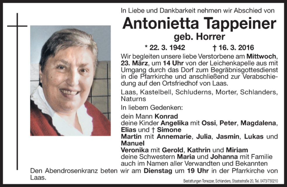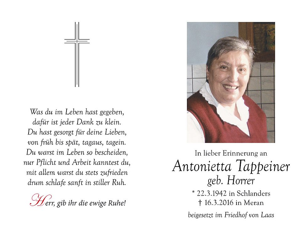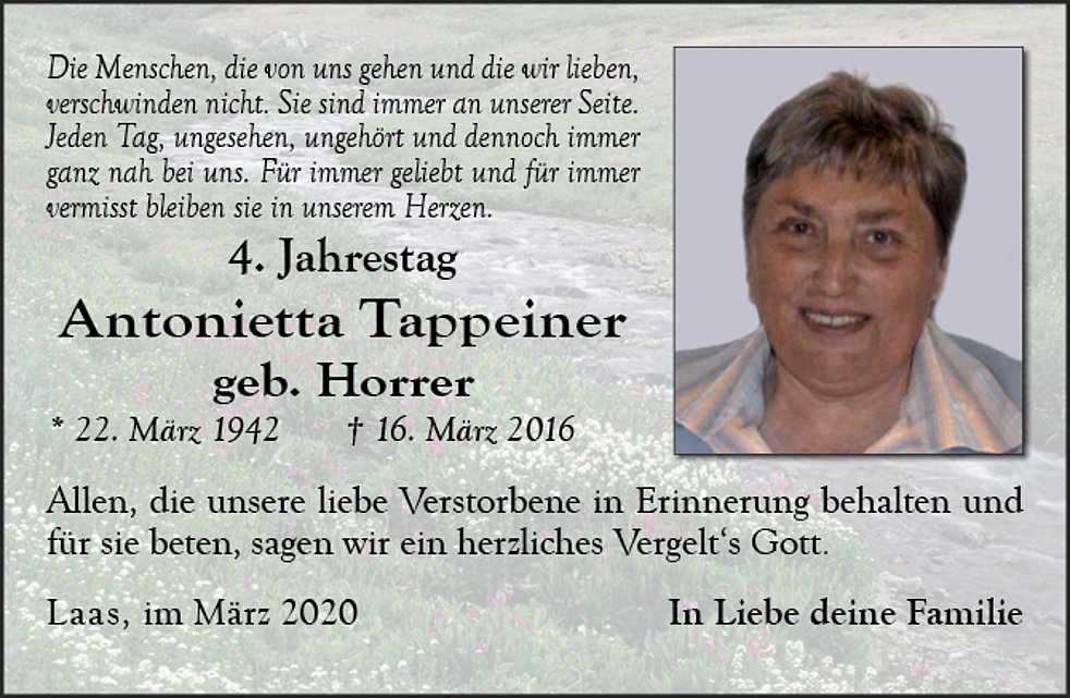Wir begleiten unsere liebe Verstorbene am Mittwoch, 23. März, um 14 Uhr von der Leichenkapelle aus mit Umgang durch das Dorf zum Begräbnisgottesdienst in die Pfarrkirche und anschließend zur Verabschiedung auf den Ortsfriedhof von Laas.