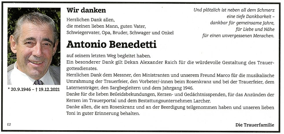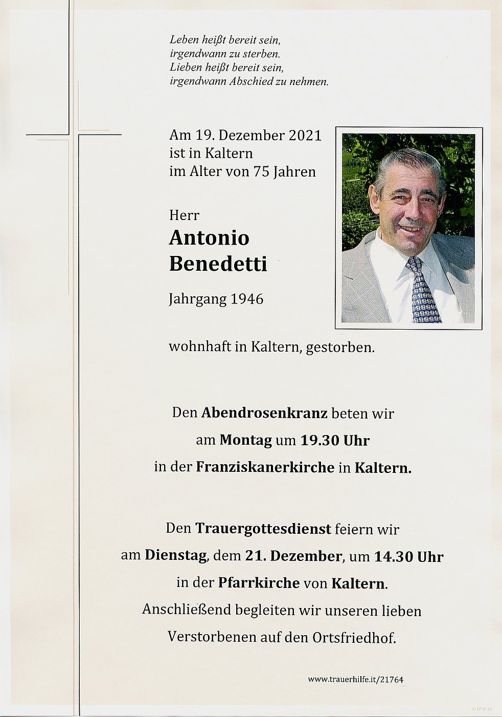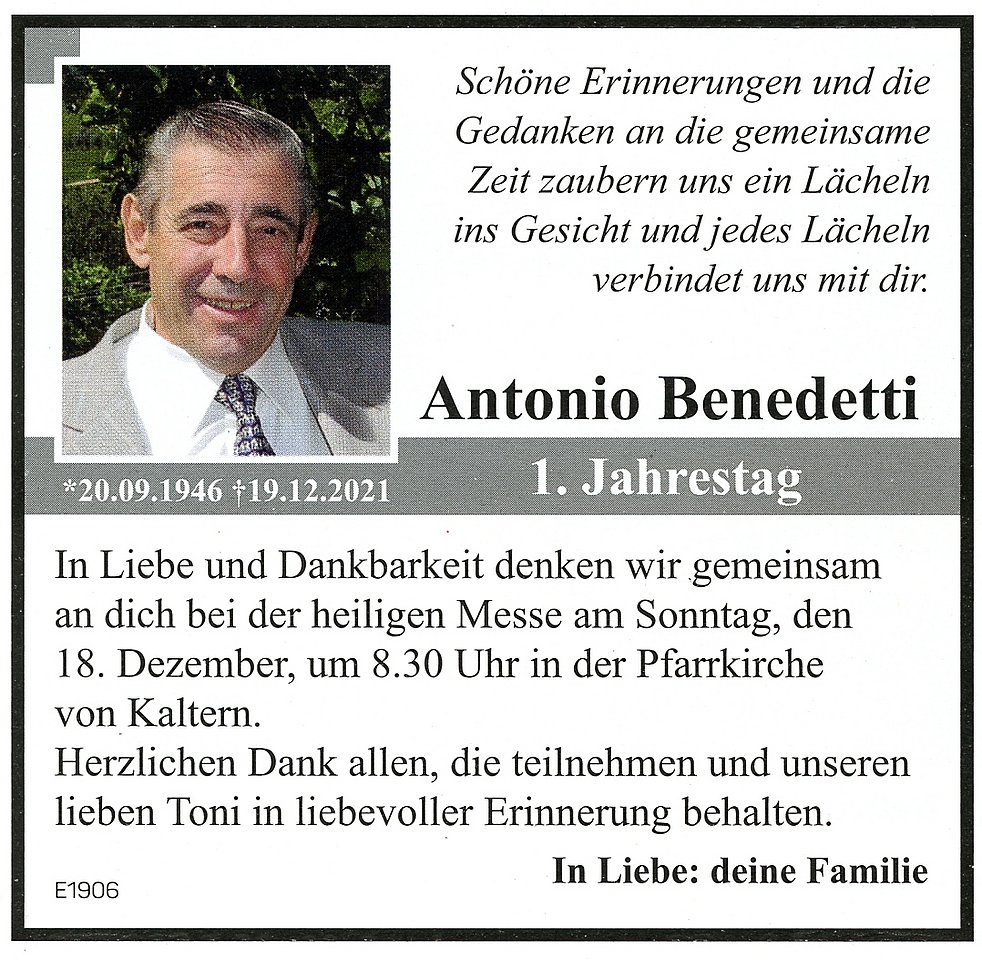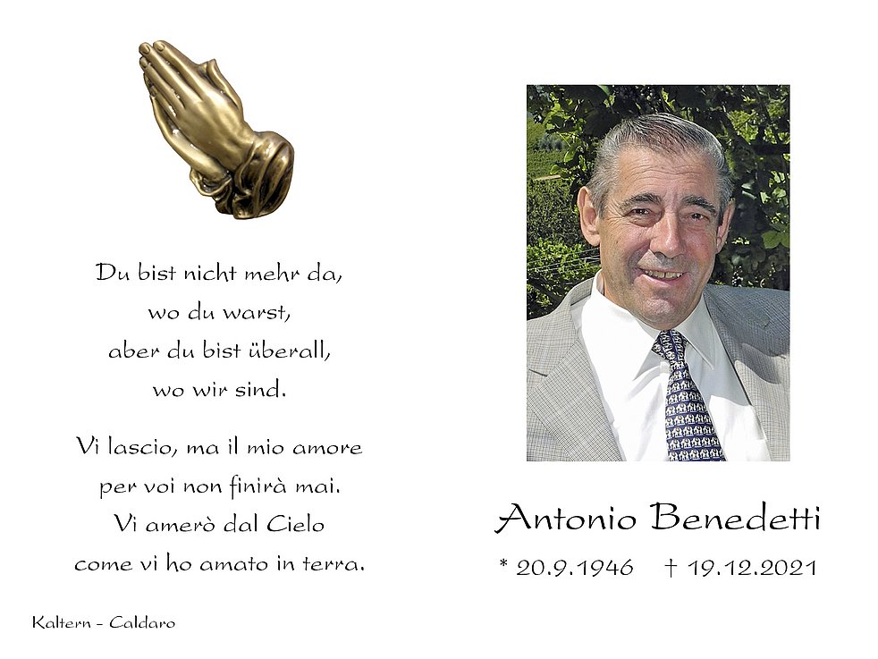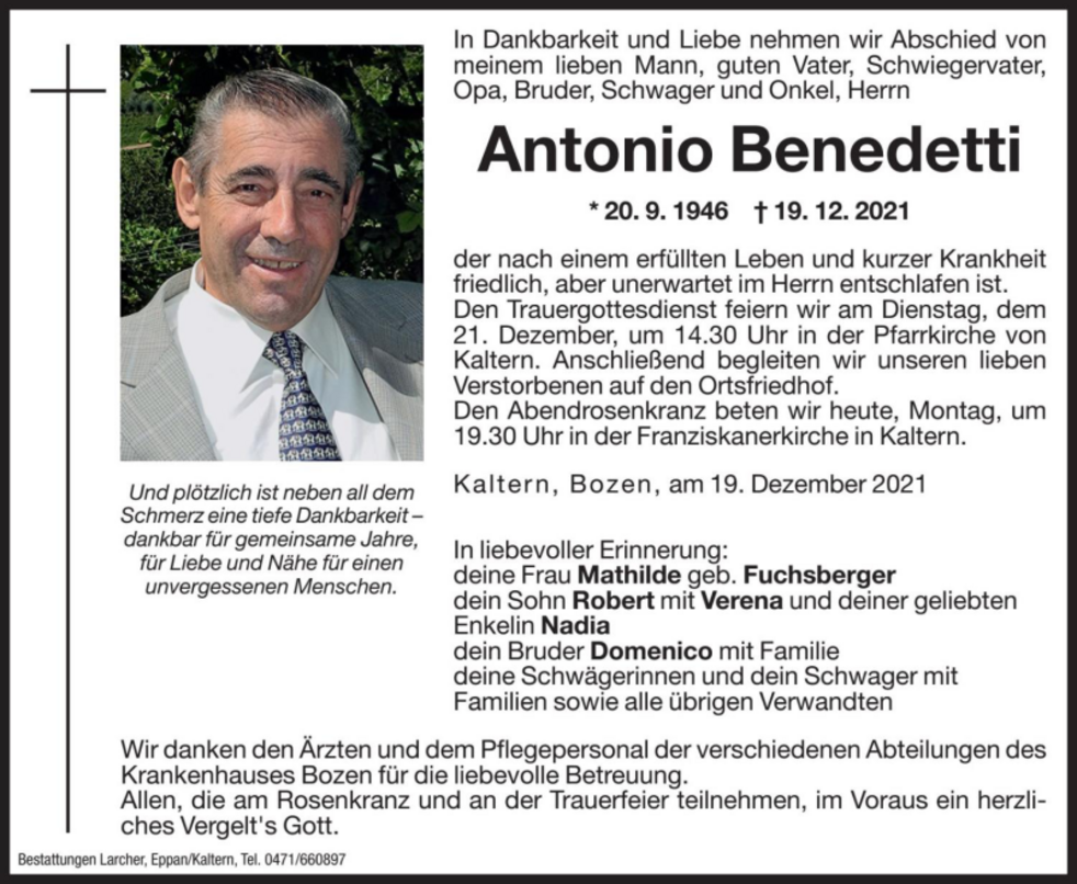Den Trauergottesdienst feiern wir am Dienstag, dem 21. Dezember um 14.30 Uhr in der Pfarrkirche von Kaltern. Anschließend begleiten wir unseren lieben Verstorbenen auf den Ortsfriedhof.