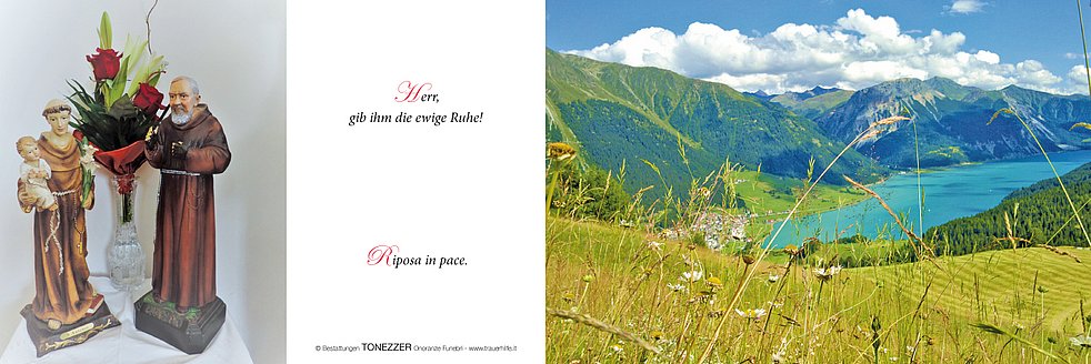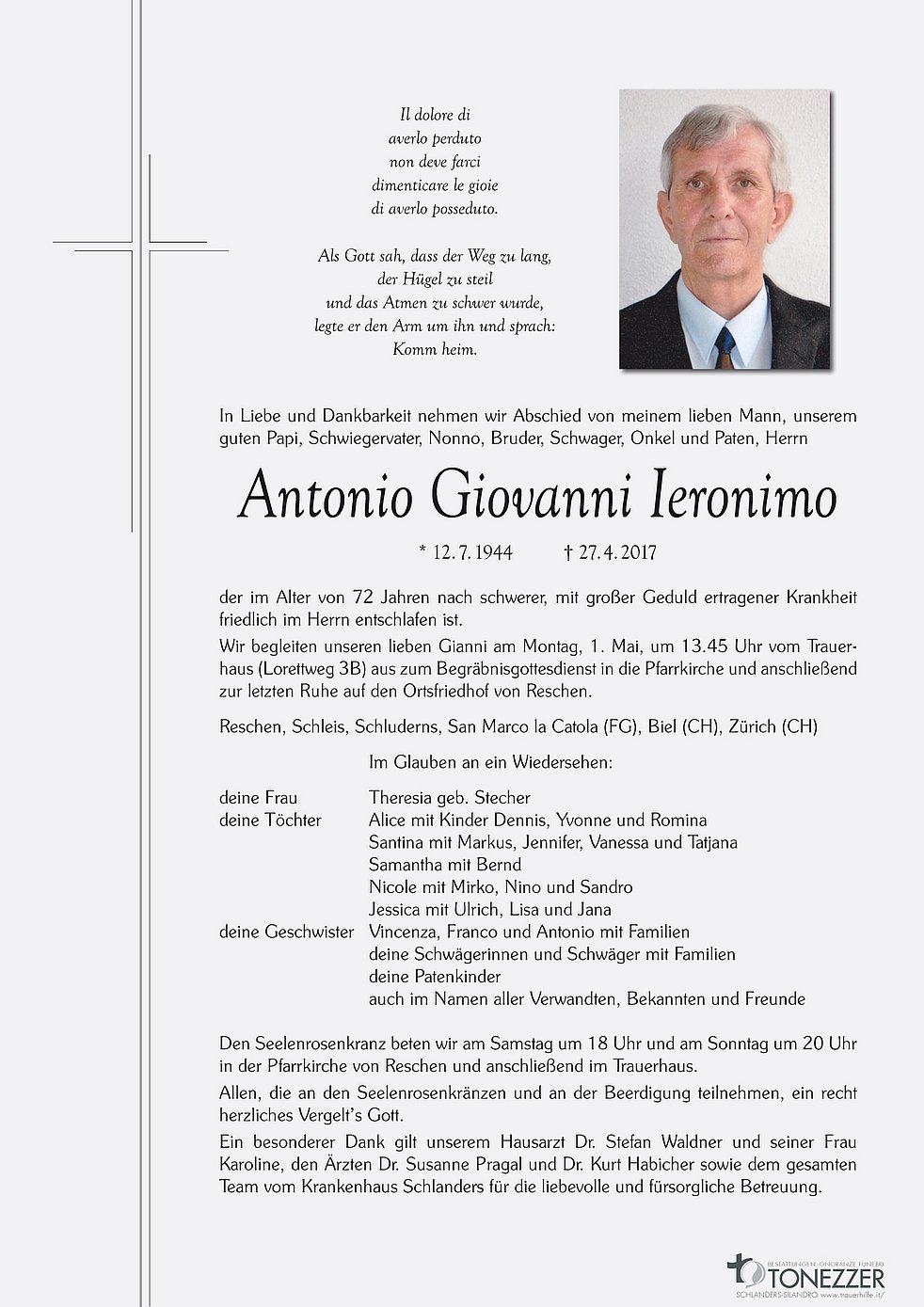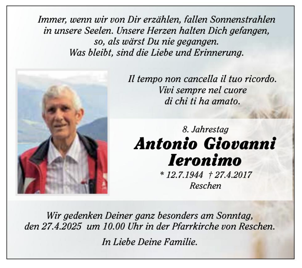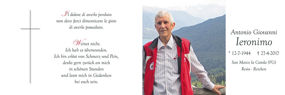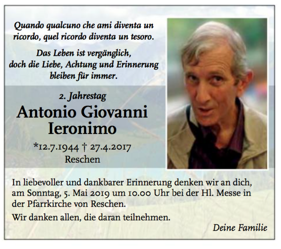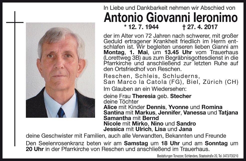 Wir begleiten unseren lieben Gianni am Montag, 1. Mai, um 13.45 Uhr vom Trauerhaus (Lorettweg 3B) aus zum Begräbnisgottesdienst in die Pfarrkirche und anschließend zur letzten Ruhe auf den Ortsfriedhof von Reschen.
