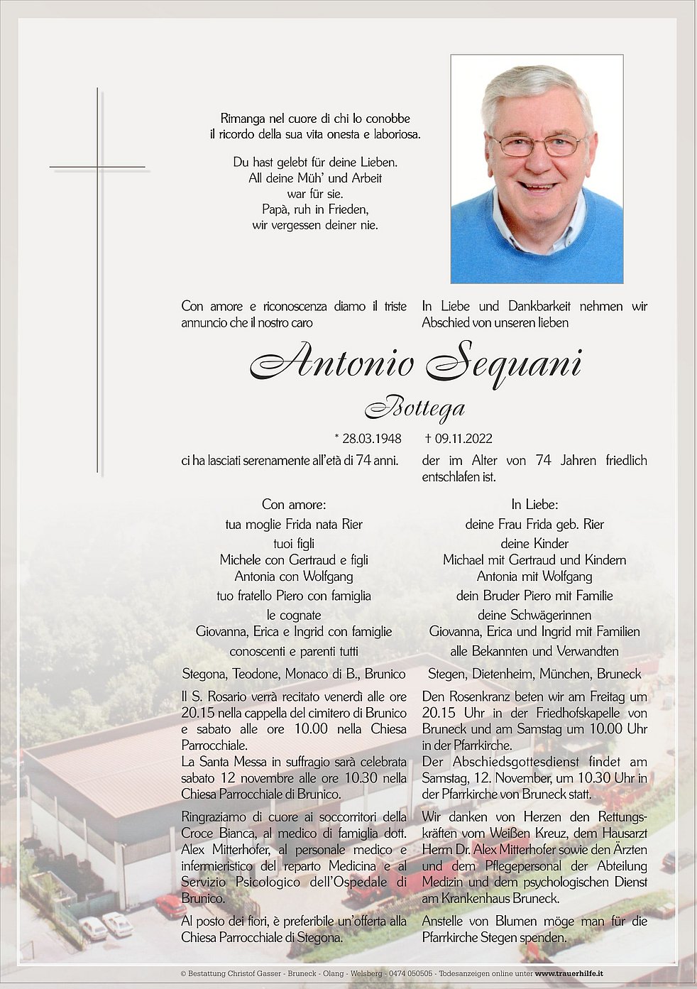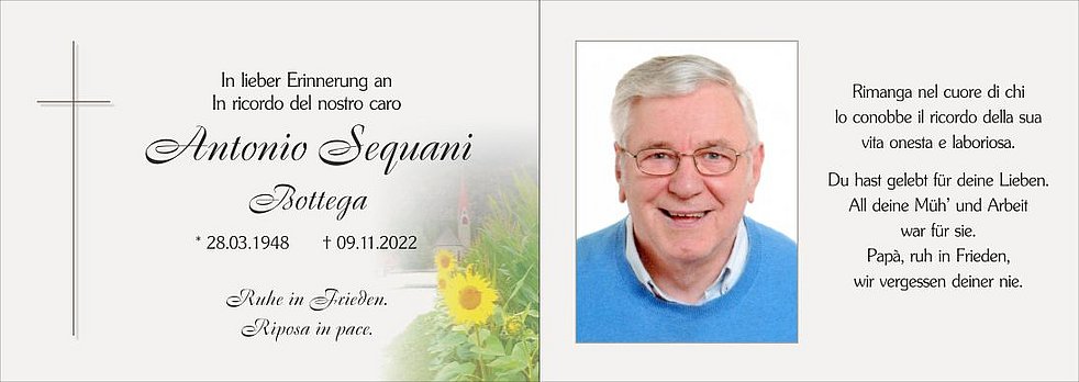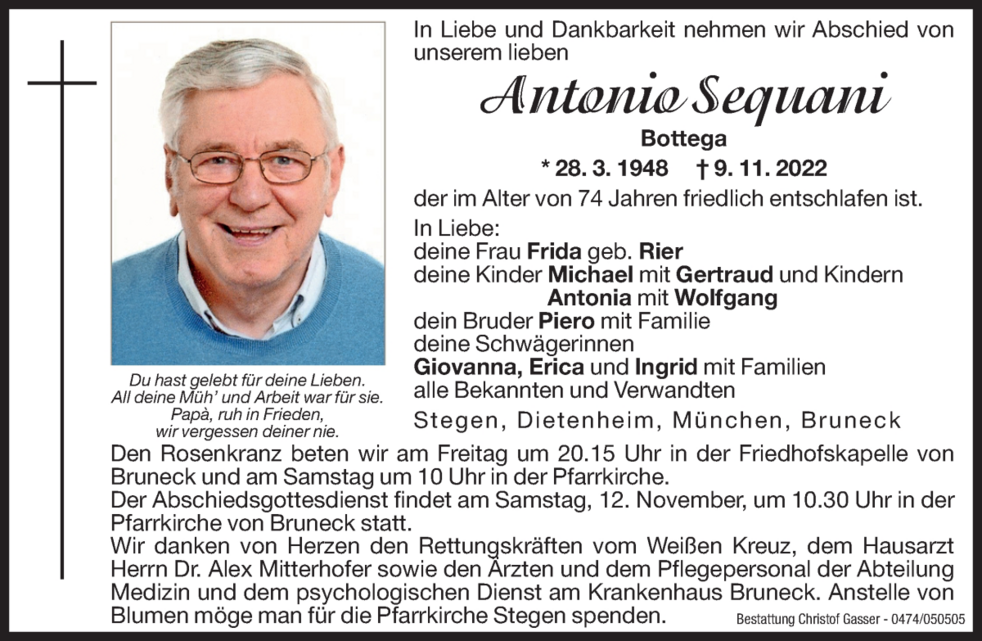 Anstelle von Blumen möge man für die Pfarrkirche Stegen spenden.