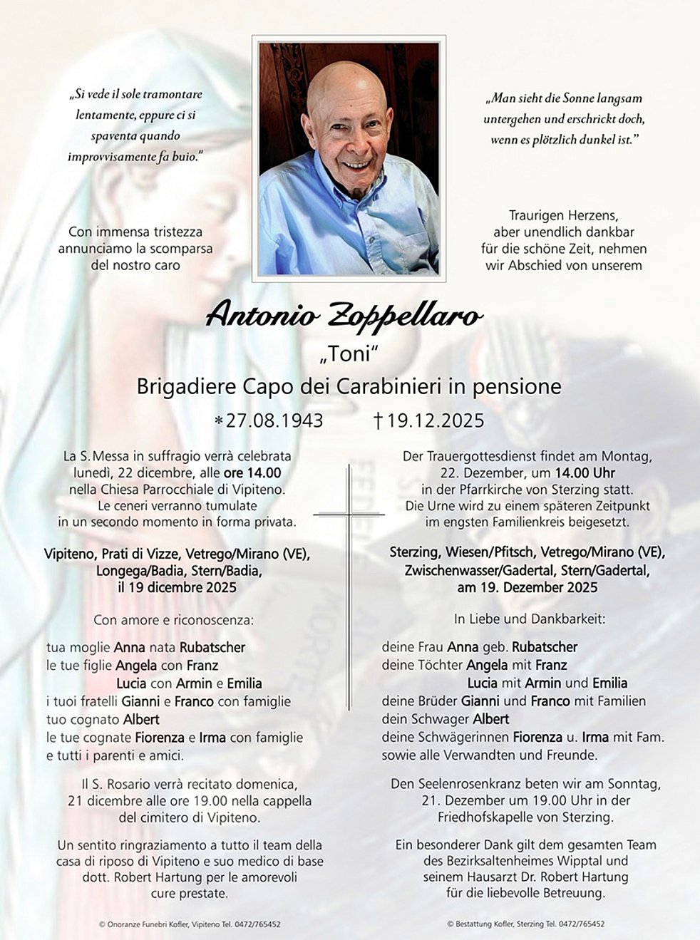 Der Trauergottesdienst findet am Montag, 22. Dezember, um 14.00 Uhr in der Pfarrkirche von Sterzing statt.