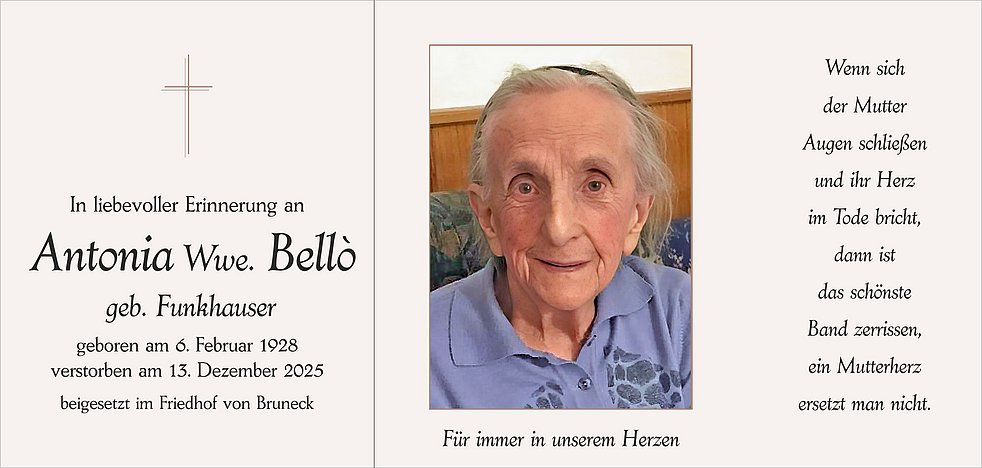 Unsere liebe Mama ist ab Dienstag in der Friedhofskapelle von Bruneck aufgebahrt.