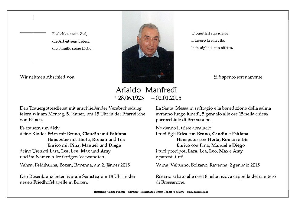 Den Trauergottesdienst mit anschließender Verabschiedung feiern wir am Montag, 5. Jänner, um 15 Uhr in der Pfarrkirche von Brixen.