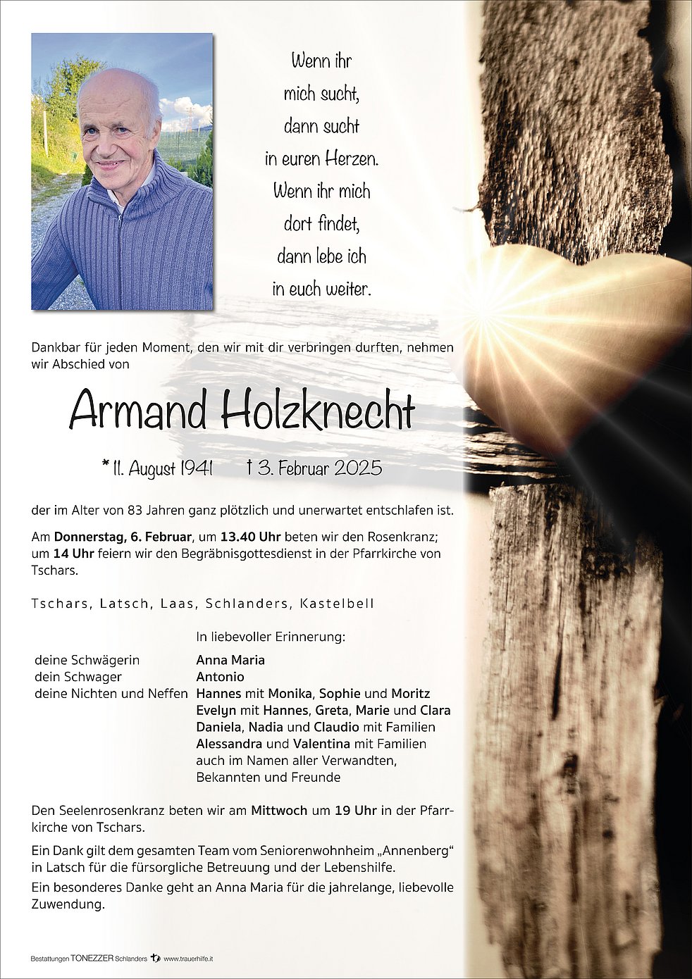 Der Trauerfamilie wünschen wir viel Kraft und Trost in dieser schweren Zeit und die Hoffnung auf ein Wiedersehen mit Armand, der nun so rasch seiner Schwester Margit gefolgt ist.
