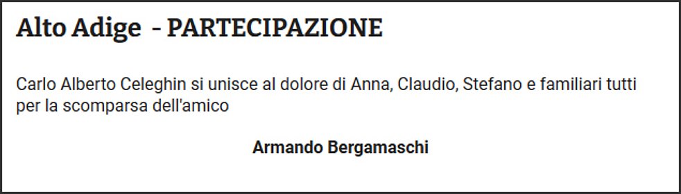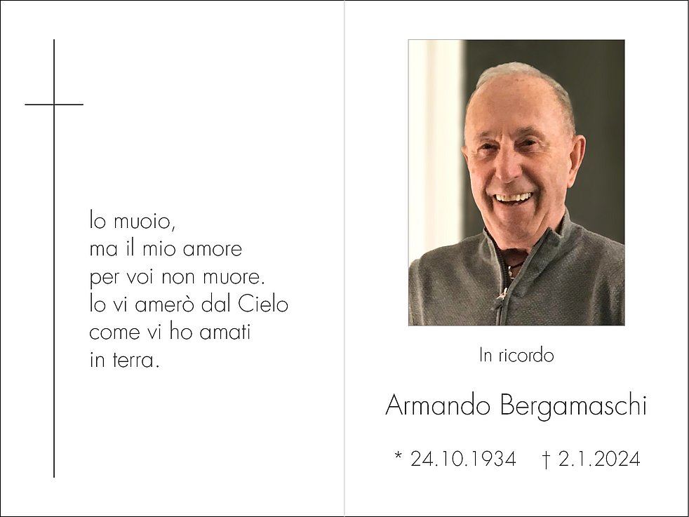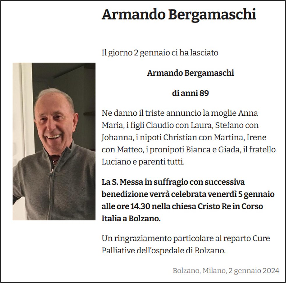 Ne danno il triste annuncio la moglie Anna Maria, i figli Claudio con Laura, Stefano con Johanna, i nipoti Christian con Martina, Irene con Matteo, i pronipoti Bianca e Giada, il fratello Luciano e parenti tutti.