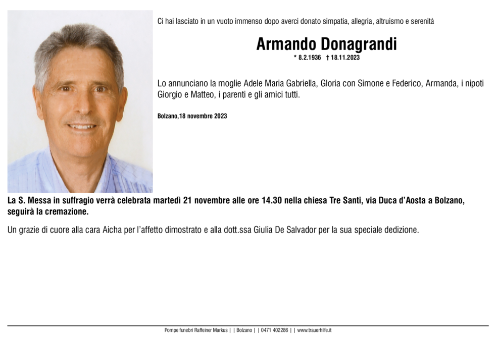 La S. Messa in suffragio verrà celebrata martedì 21 novembre alle ore 14.30 nella chiesa Tre Santi, via Duca d’Aosta a Bolzano, seguirà la cremazione.
