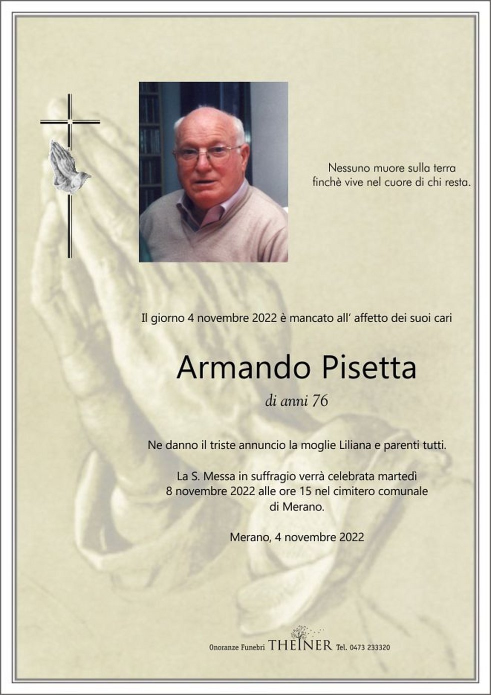La S. Messa in suffragio verrà celebrata martedì 8 novembre 2022 alle ore 15 nel cimitero comunale di Merano.