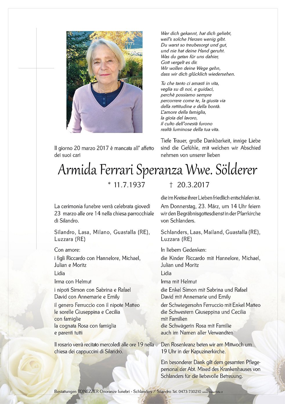 La cerimonia funebre verrà celebrata giovedì 23 marzo alle ore 14 nella chiesa parrocchiale di Silandro.