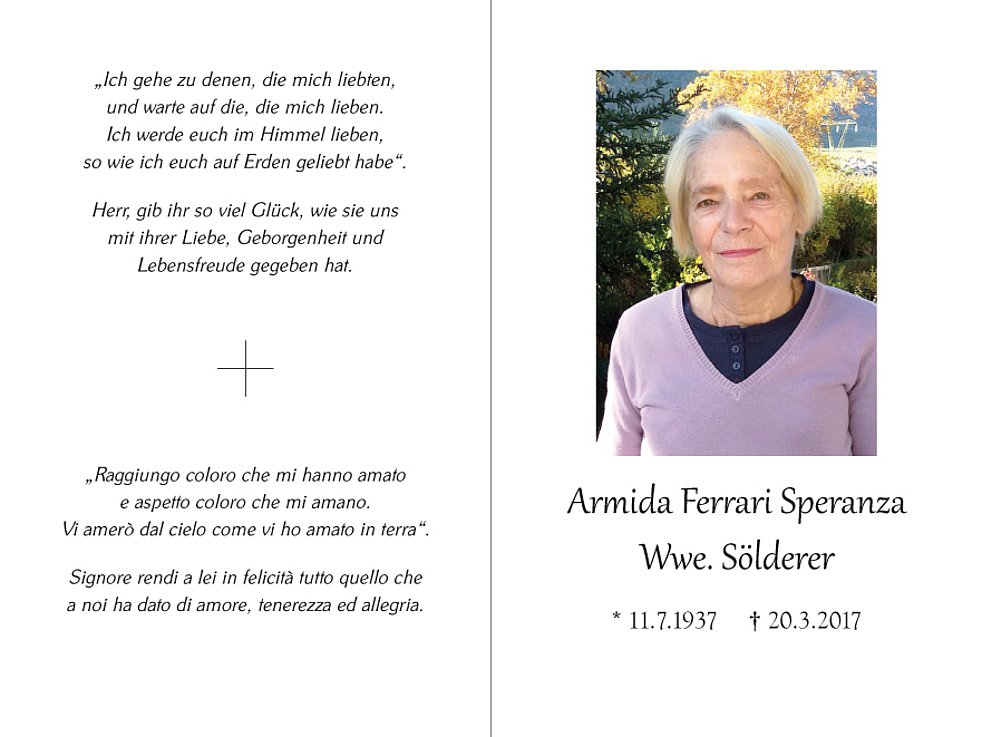 Am Donnerstag, 23. März, um 14 Uhr feiern wir den Begräbnisgottesdienst in der Pfarrkirche von Schlanders.
