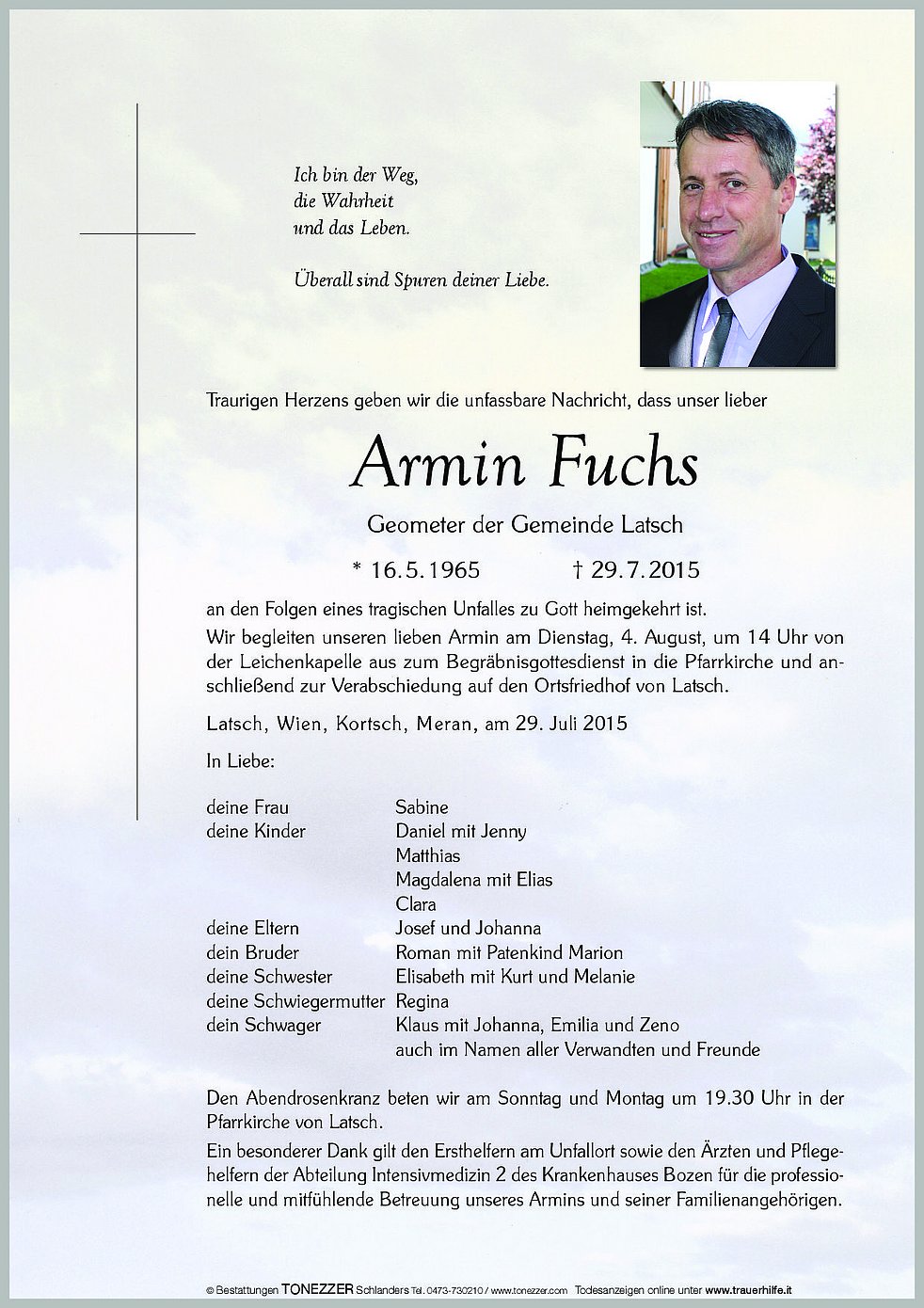 Wir begleiten unseren lieben Armin am Dienstag, 4. August, um 14 Uhr von der Leichenkapelle aus zum Begräbnisgottesdienst in die Pfarrkirche und anschließend zur Verabschiedung auf den Ortsfriedhof von Latsch.