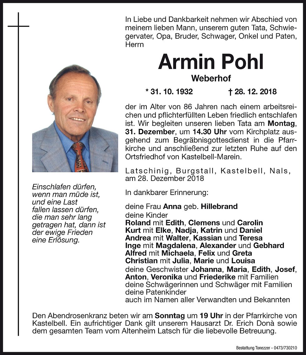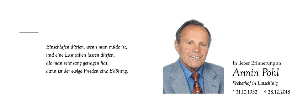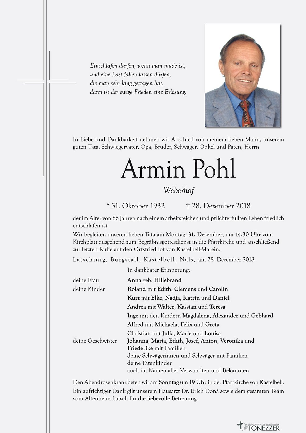 Wir begleiten unseren lieben Tata am Montag, 31. Dezember, um 14.30 Uhr vom Kirchplatz ausgehend zum Begräbnisgottesdienst in die Pfarrkirche und anschließend zur letzten Ruhe auf den Ortsfriedhof von Kastelbell-Marein.