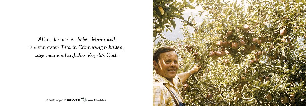 Ein aufrichtiger Dank gilt unserem Hausarzt Dr. Erich Donà sowie dem gesamten Team vom Altenheim Latsch für die liebevolle Betreuung.