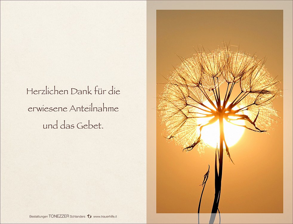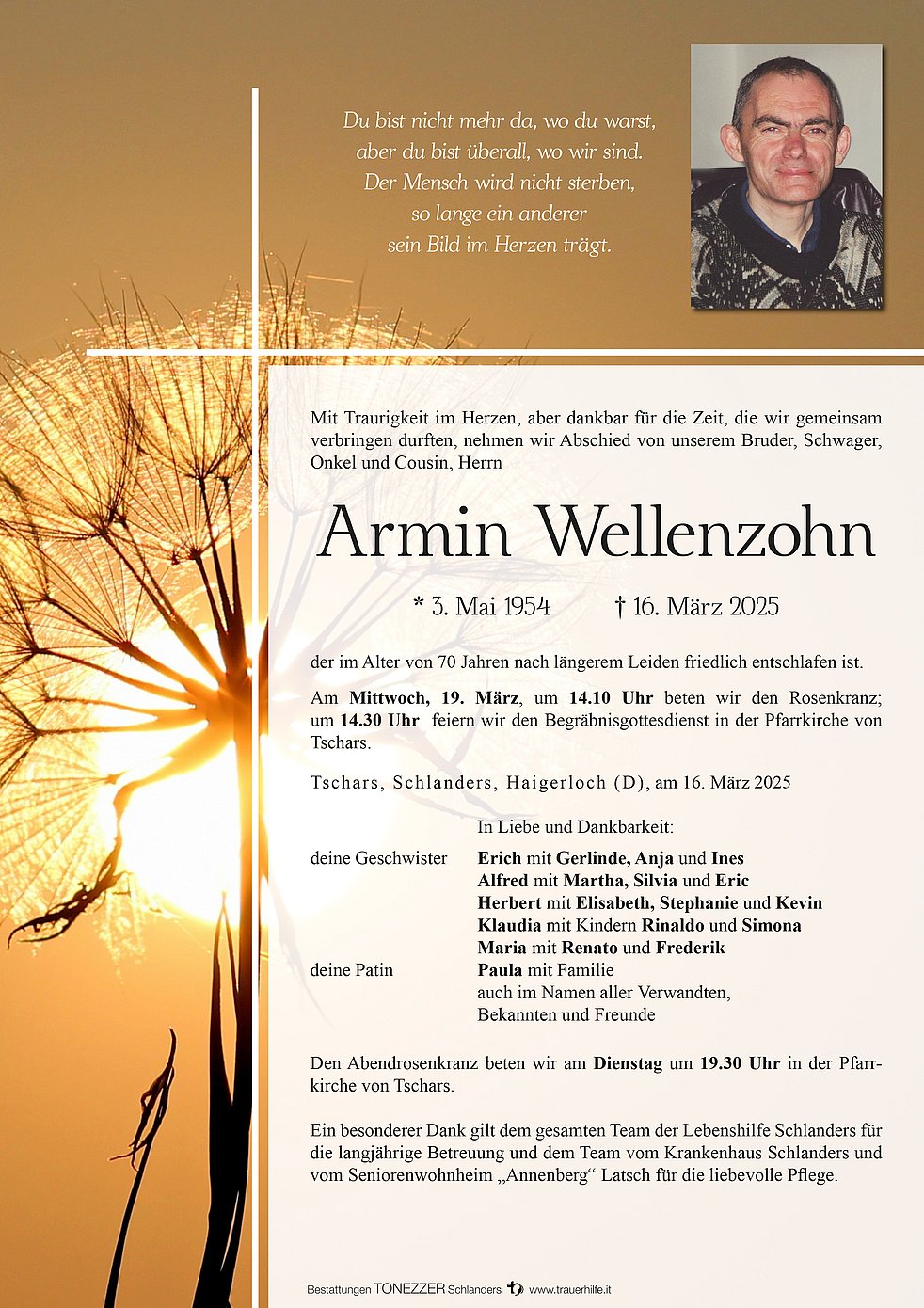 Am Mittwoch, 19. März, um 14.10 Uhr beten wir den Rosenkranz; um 14.30 Uhr feiern wir den Begräbnisgottesdienst in der Pfarrkirche von Tschars.
