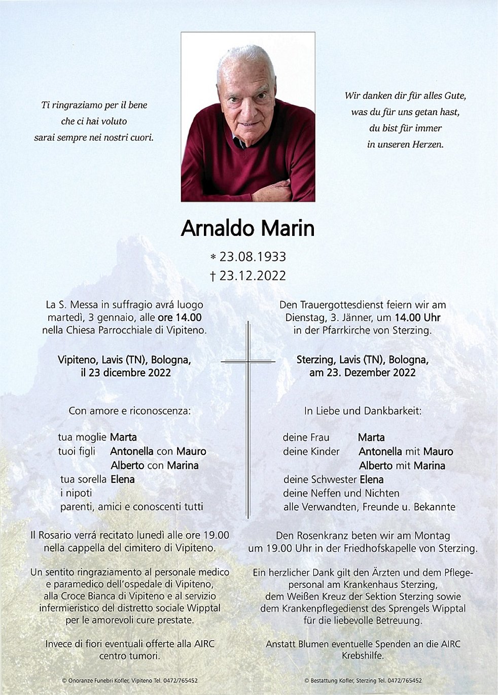 Un sentito ringraziamento al personale medico e paramedico dell‘ospedale di Vipiteno, alla Croce Bianca di Vipiteno e al servizio infermieristico del distretto sociale Wipptal per le amorevoli cure prestate.