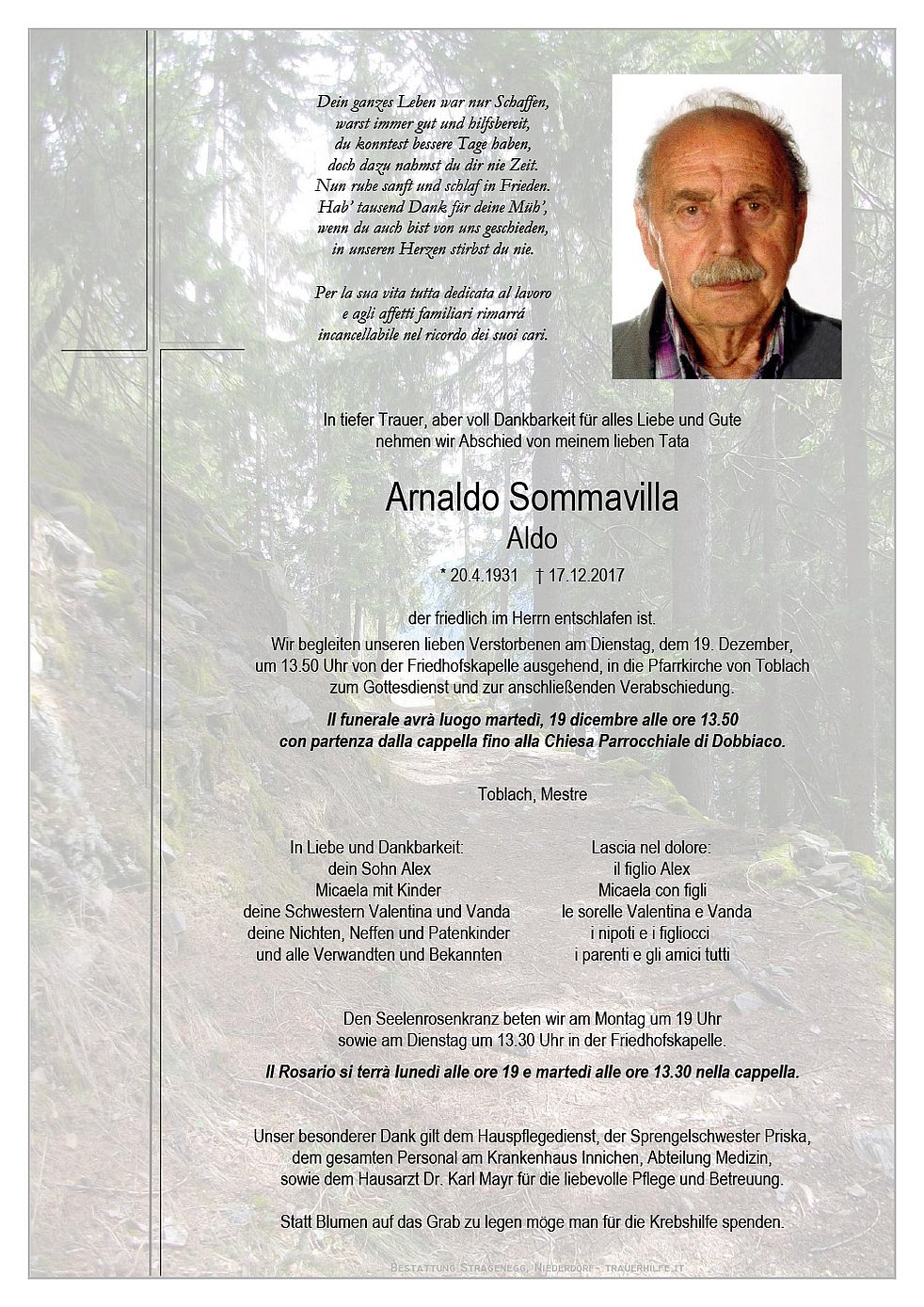 Wir begleiten unseren lieben Verstorbenen am Dienstag, dem 19. Dezember, um 13.50 Uhr von der Friedhofskapelle ausgehend, in die Pfarrkirche von Toblach zum Gottesdienst und zur anschließenden Verabschiedung.