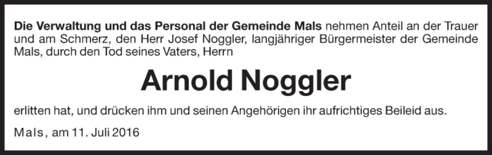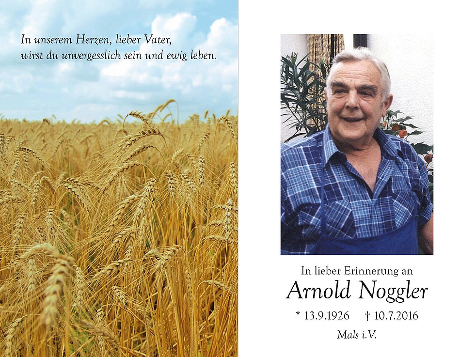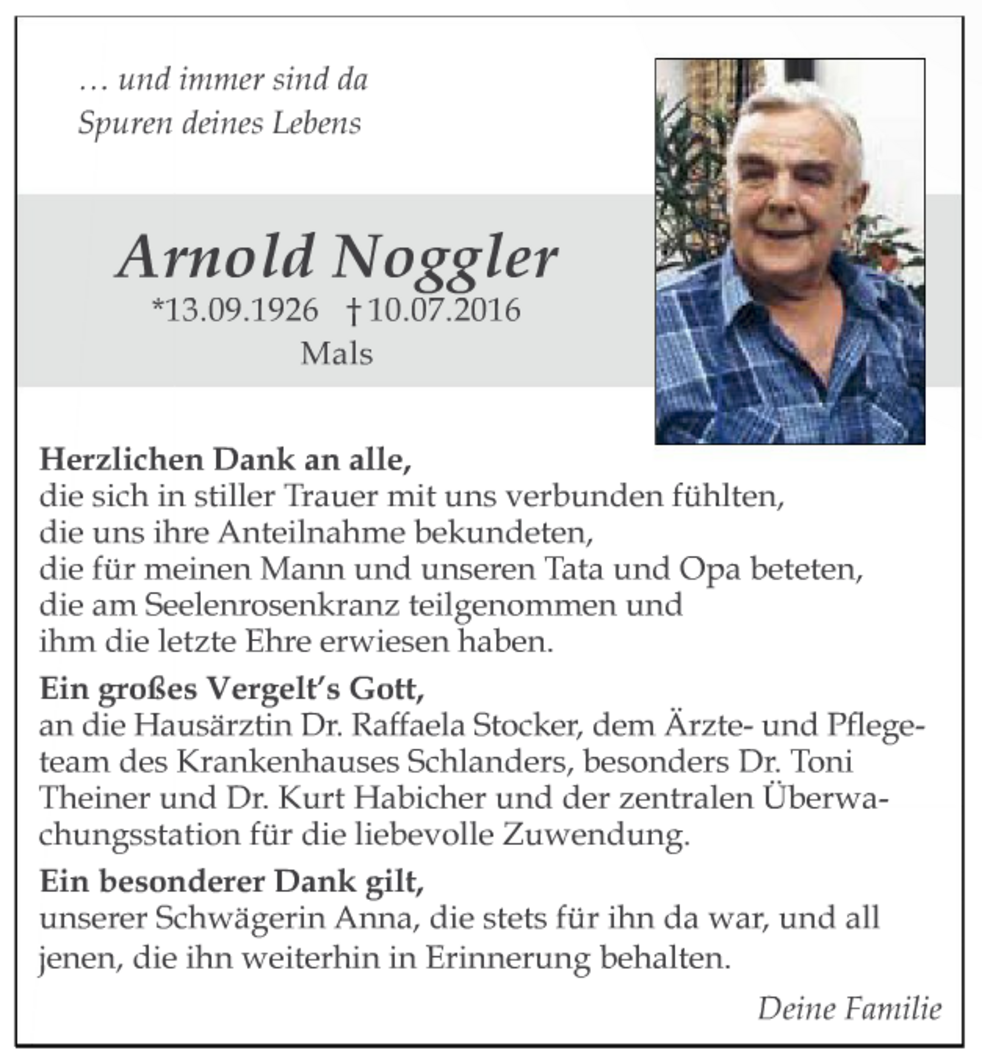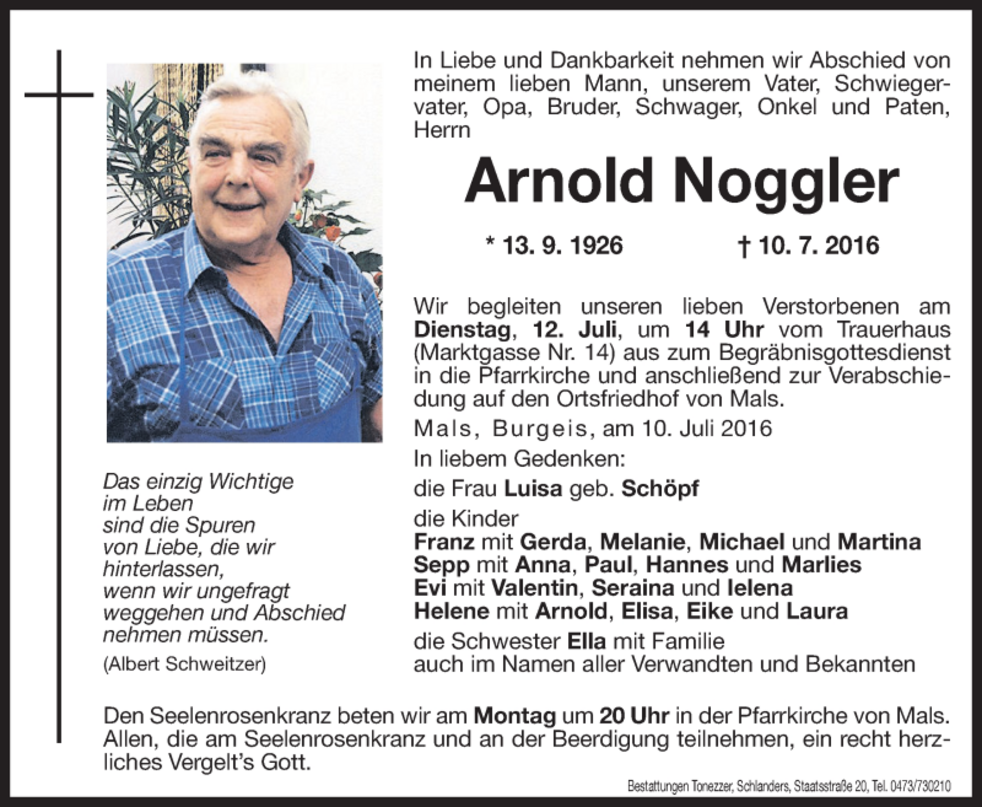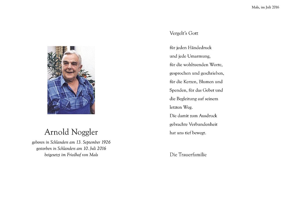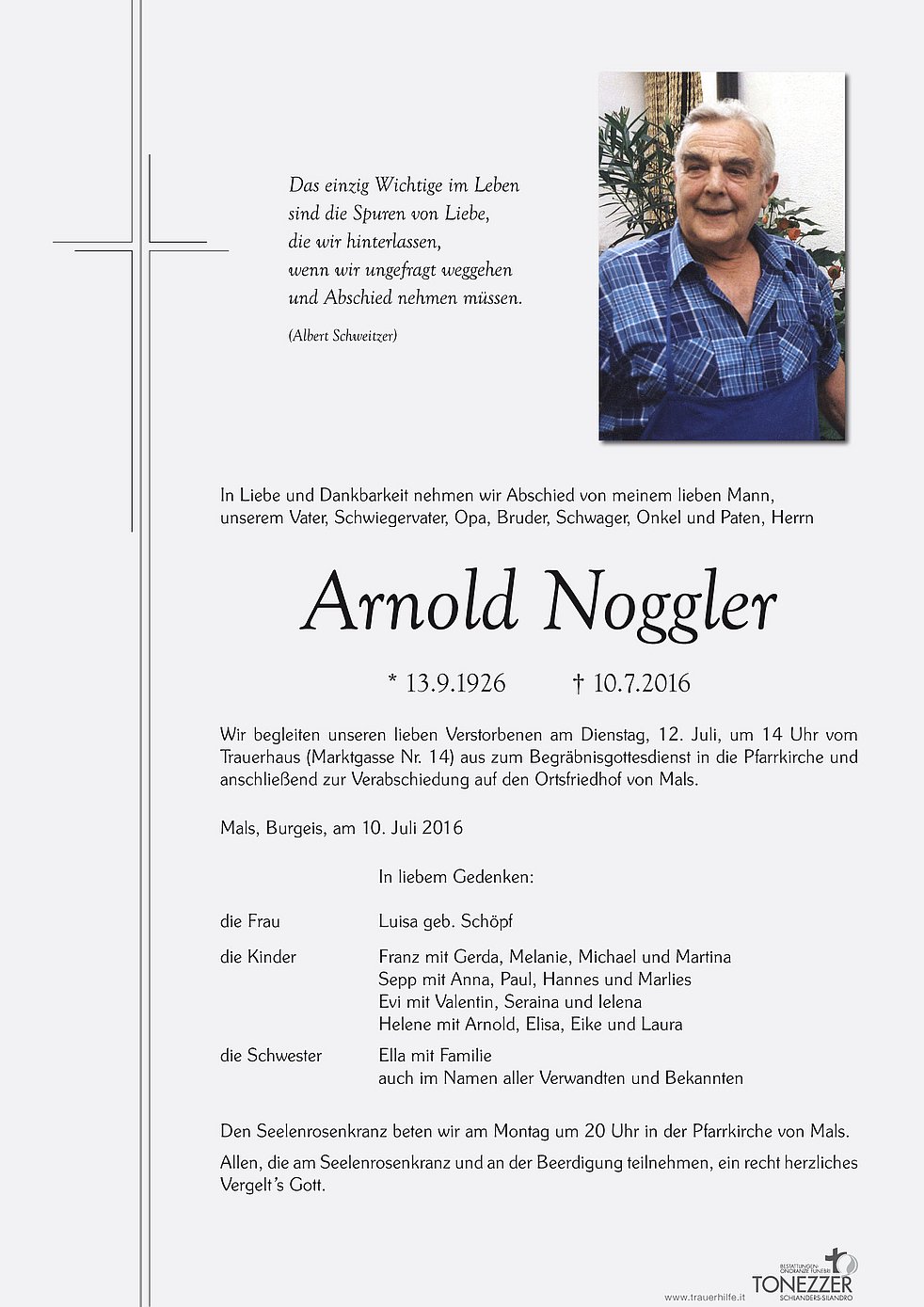 Wir begleiten unseren lieben Verstorbenen am Dienstag, 12. Juli, um 14 Uhr vom Trauerhaus (Marktgasse Nr. 14) aus zum Begräbnisgottesdienst in die Pfarrkirche und anschließend zur Verabschiedung auf den Ortsfriedhof von Mals.