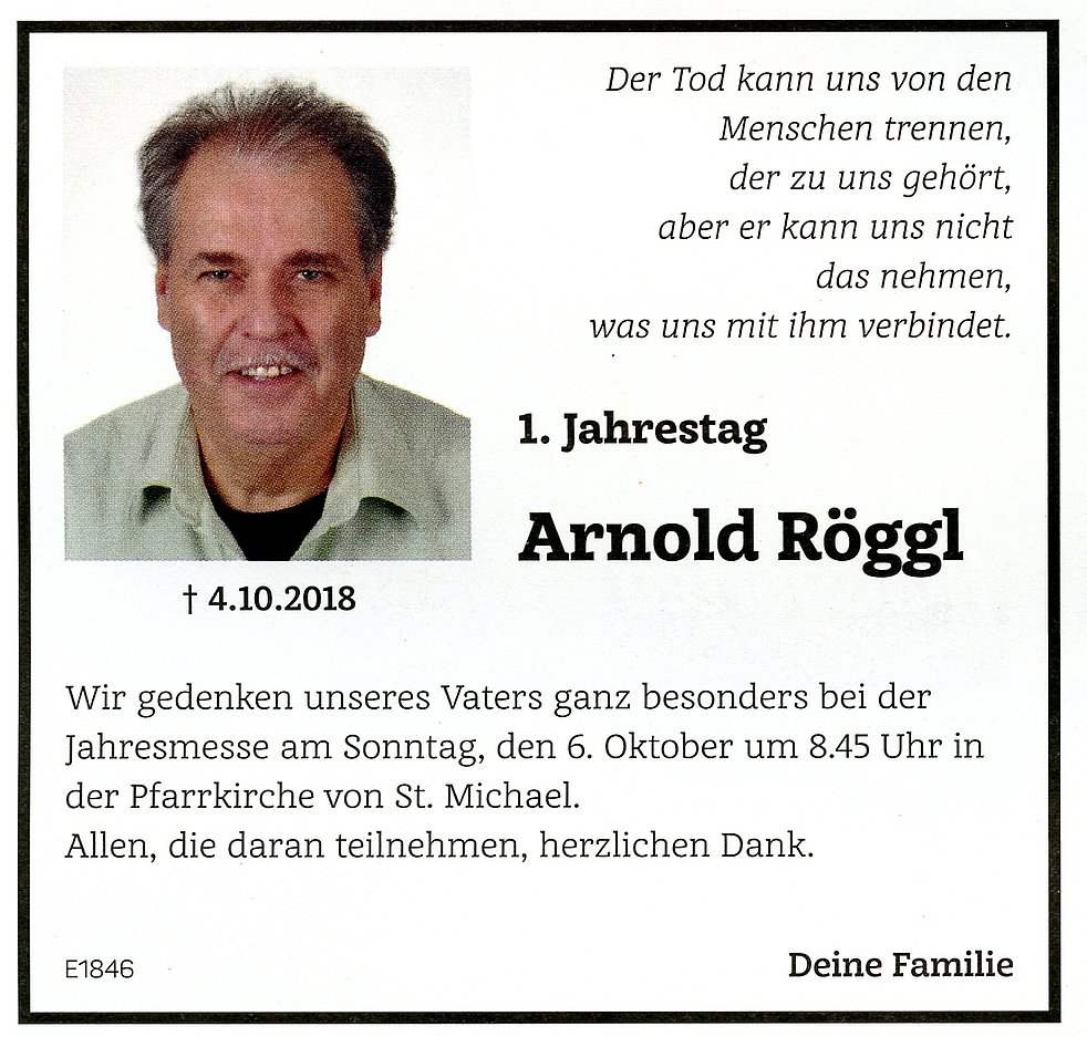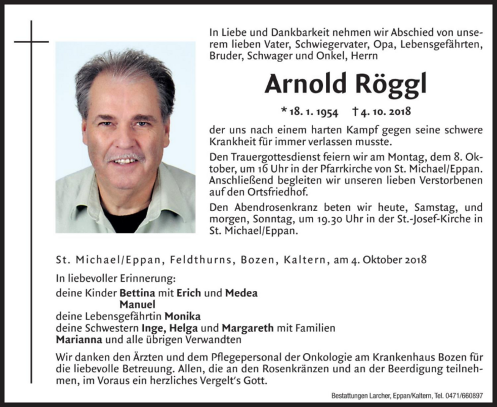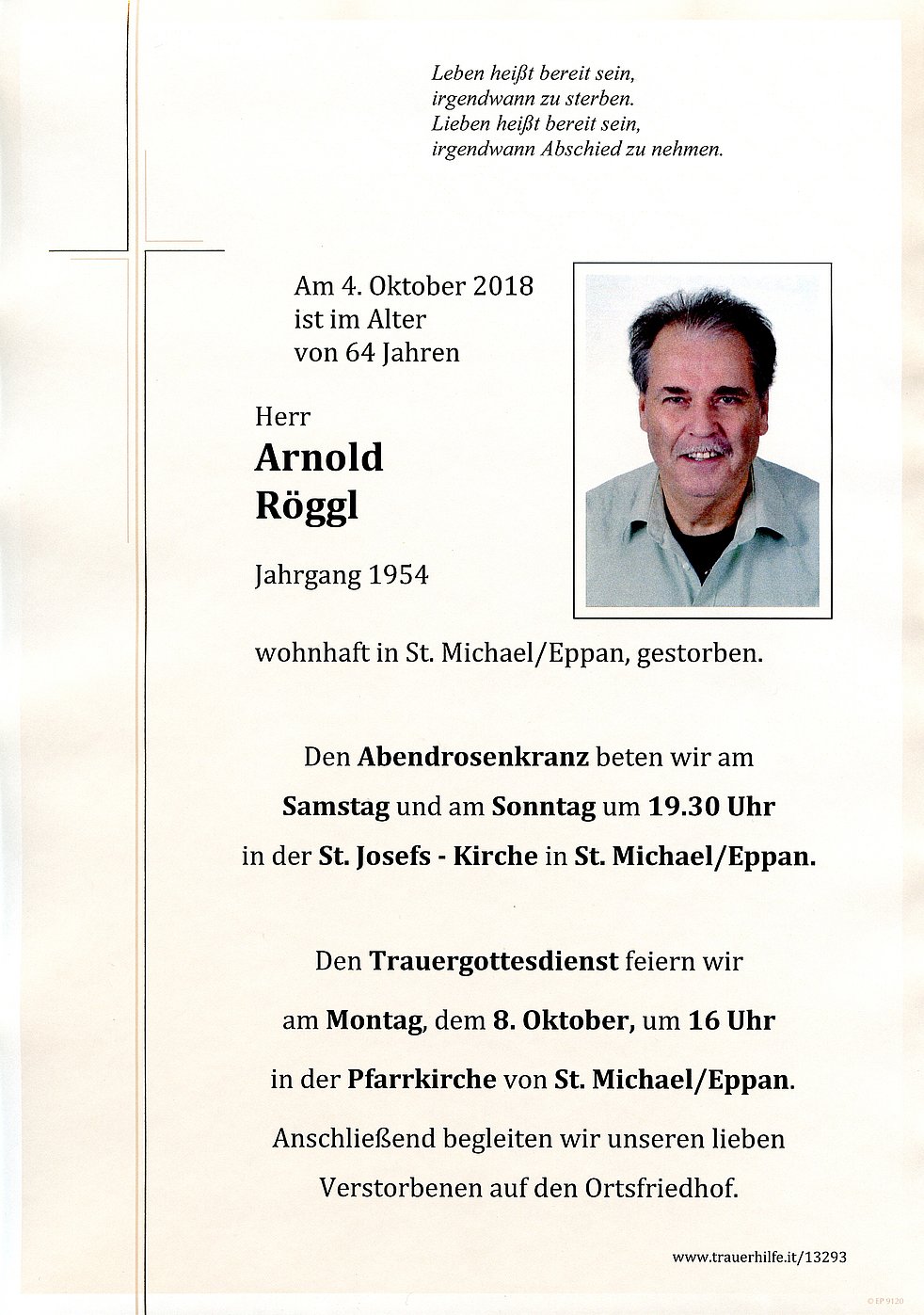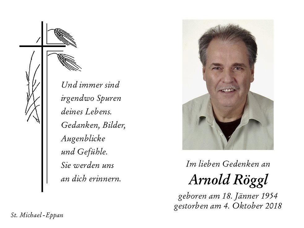 Den Trauergottesdienst feiern wir am Montag, dem 8. Oktober um 16 Uhr in der Pfarrkirche von St. Michael/Eppan. Anschließend begleiten wir unseren lieben Verstorbenen auf den Ortsfriedhof.