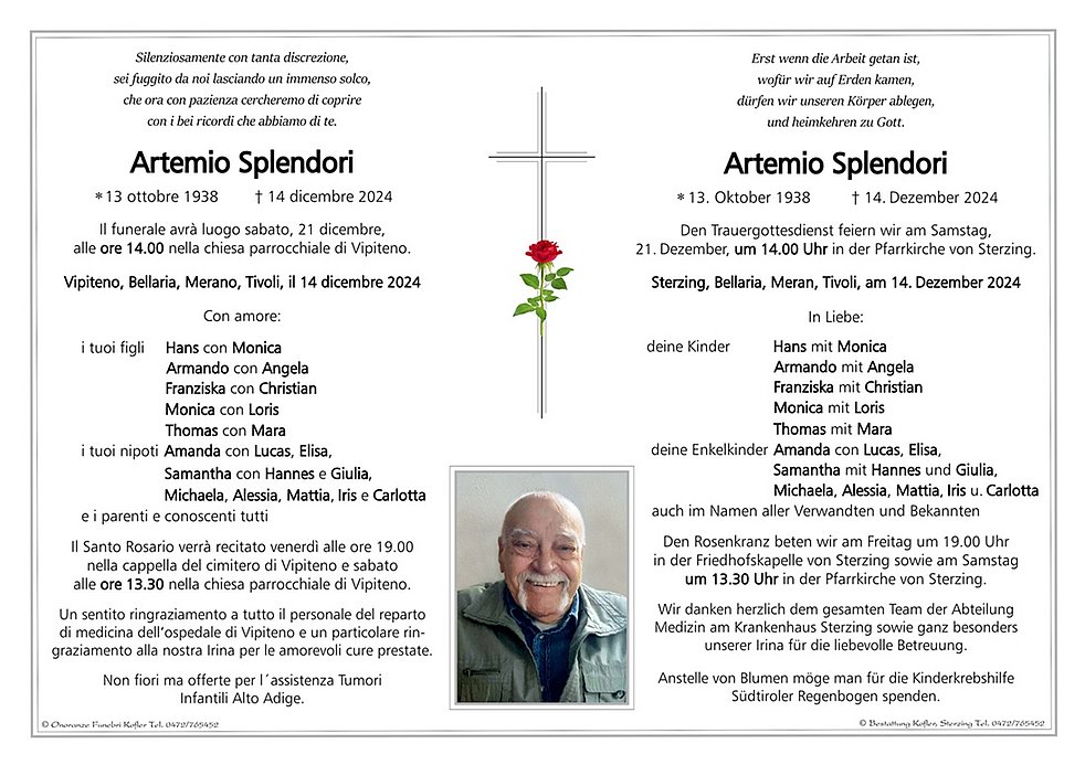 Anstelle von Blumen möge man für die Kinderkrebshilfe Südtiroler Regenbogen spenden.