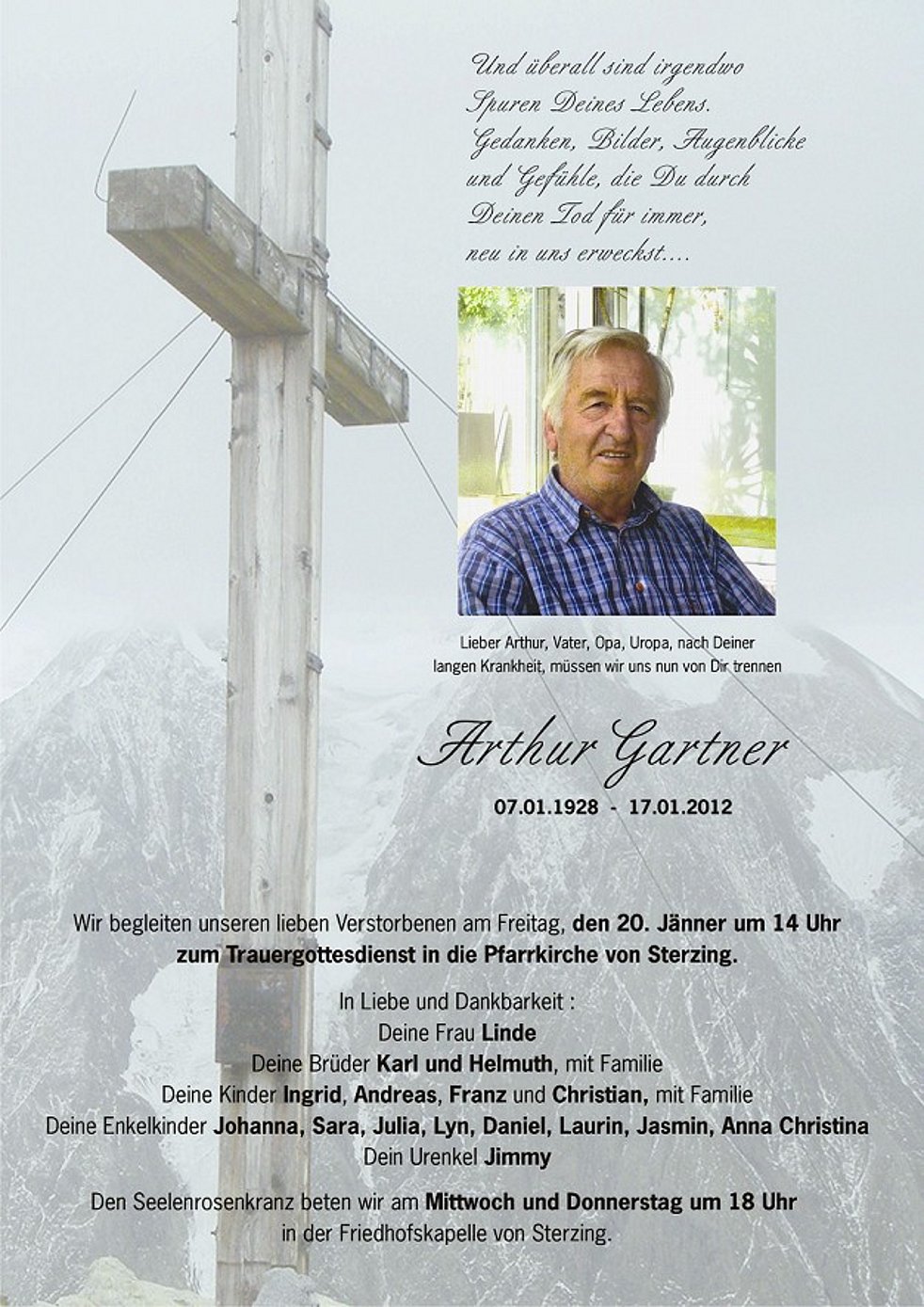 Lieber Arthur, Vater, Opa, Uropa, nach Deiner langen Krankheit,