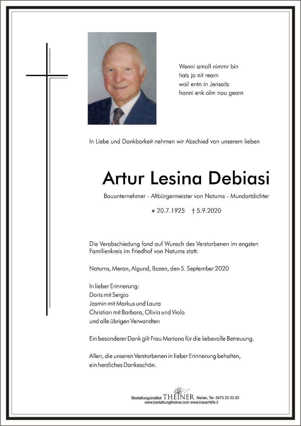 Die Verabschiedung fand auf Wunsch des Verstorbenen im engsten Familienkreis im Friedhof von Naturns statt.