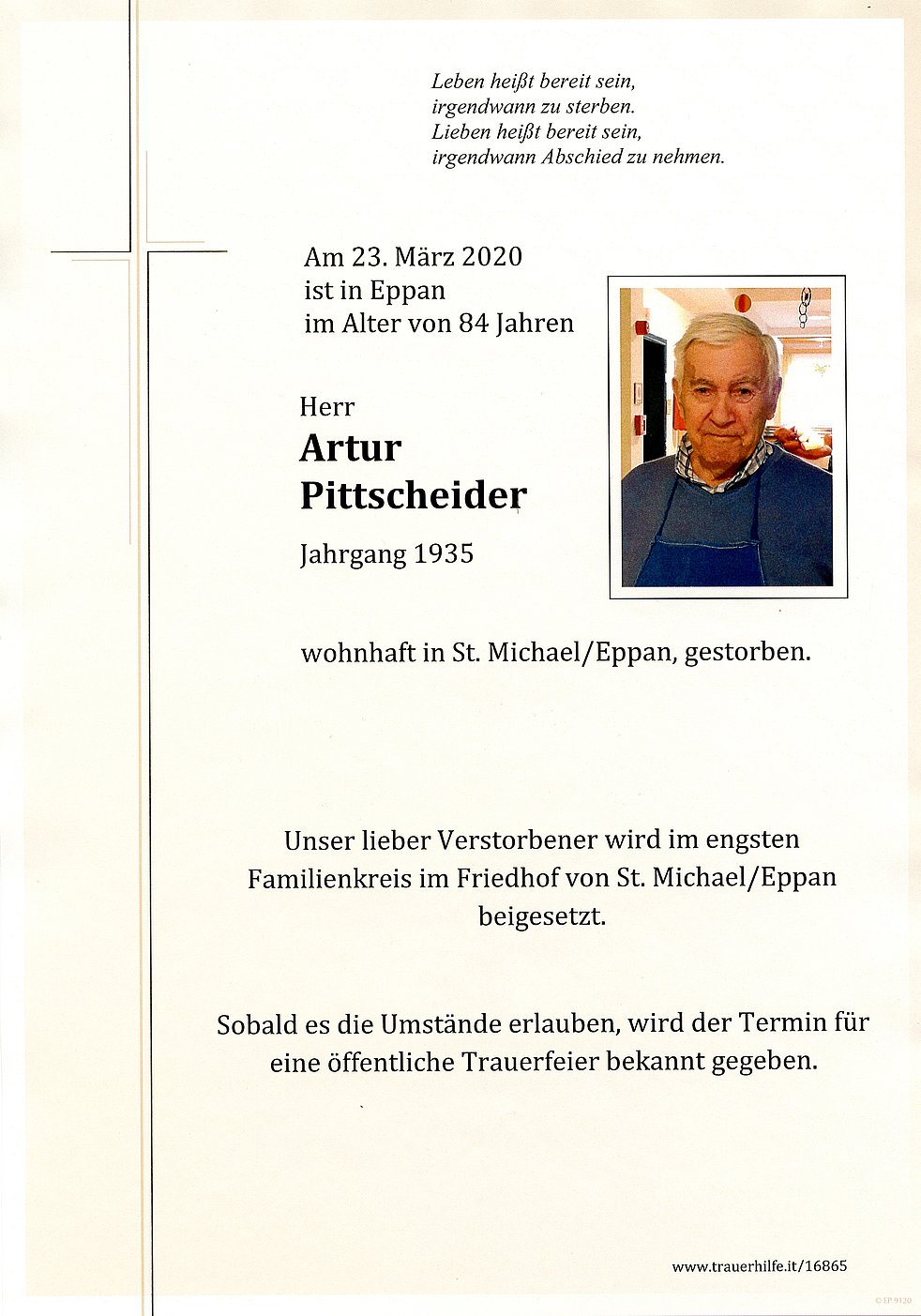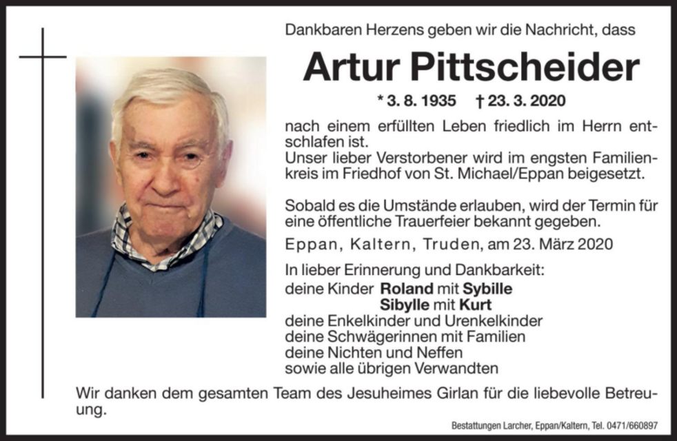 Unser lieber Verstorbener wird im engsten Familienkreis im Friedhof von St. Michael/Eppan beigesetzt.